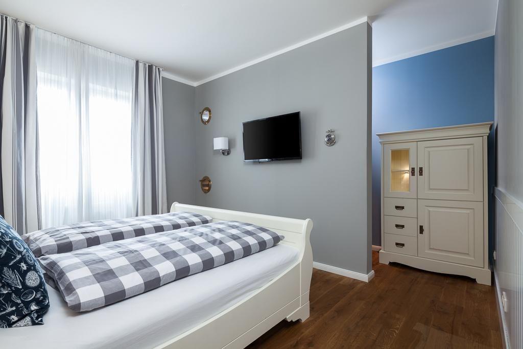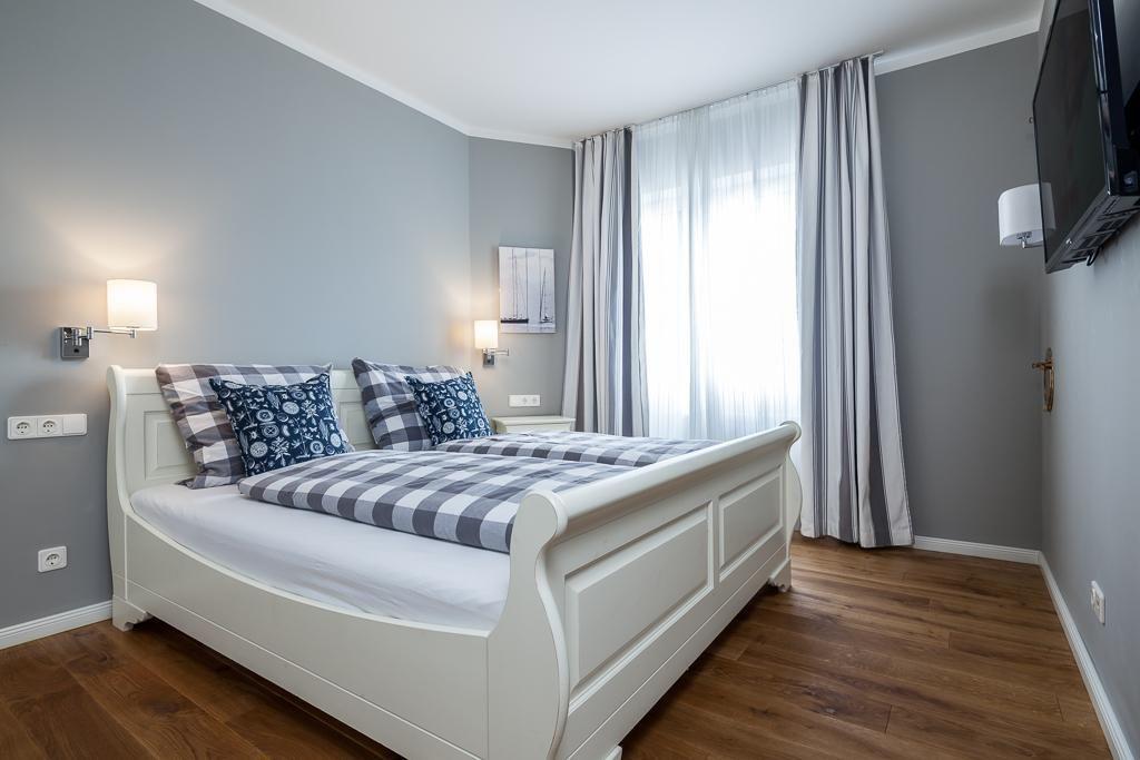 Im ganz in grau gehaltene Schlafzimmer schaffen das einladende Doppelbett im Landhausstil und der moderne Wand-Fernseher gemütliche Atmosphäre.