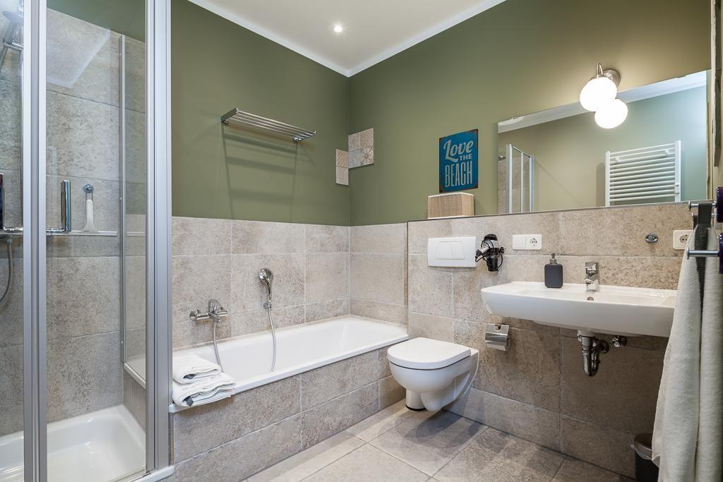 Das große Vollbad mit Badewanne und separater Regen- und Brausedusche, Fön und Handtuchheizung ist mit Naturstein gefliest und bietet genug Platz für alle persönlichen Dinge.