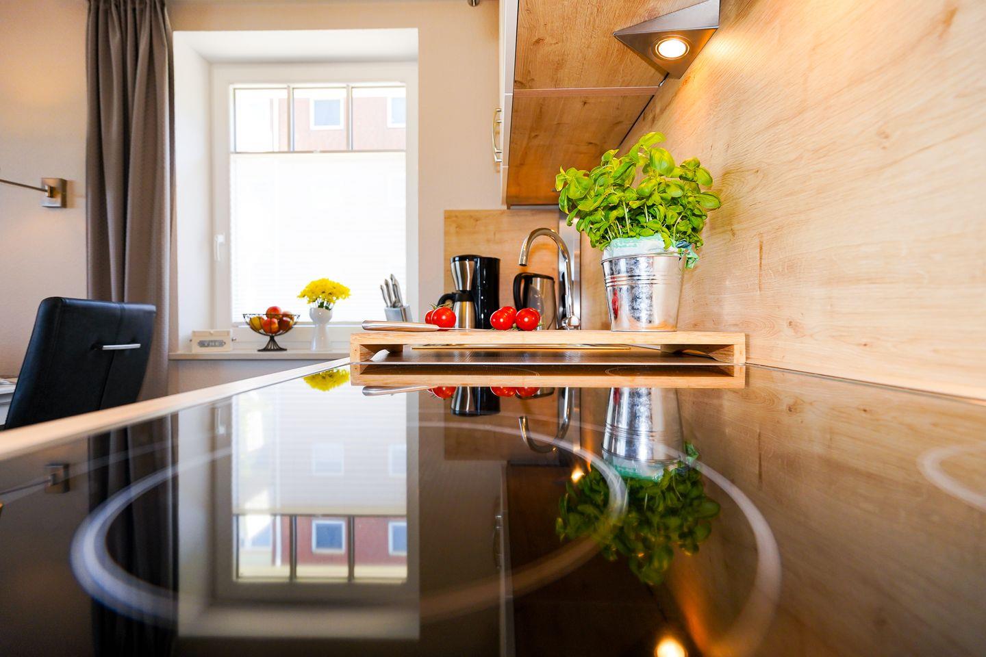 Auf großzügigen 56 qm, die ideale Größe für 2 bis 3 Personen, finden Sie vom Eingangsbereich kommend, das offene Wohnzimmer mit Schlafcouch (ca. 140cm x 180cm), Leseecke zum Entspannen, eine gut ausgestattete integrierte Küchenzeile (Spülmaschine, Backofen, Mikrowelle, Kühlschrank mit Gefrierfach, Cerankochfeld, Kaffeemaschine etc.) mit gemütlichem Essplatz und Zugang zur Terrasse.