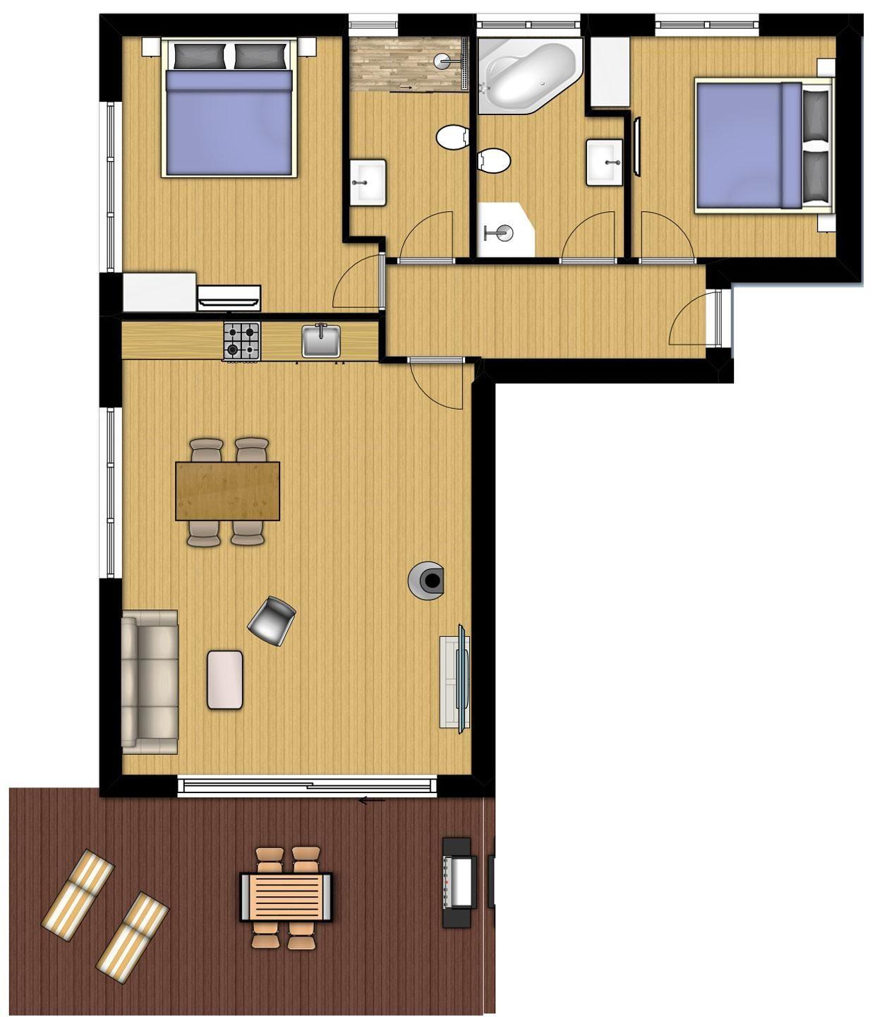 In der Wohnung gibt es ein Duschbad mit Regenbrause sowie ein weiteres Badezimmer mit Whirlwanne. Das schöne Wohnzimmer besticht durch seine Helligkeit. Die voll ausgestattete Küche, ein Ess- sowie ein gemütlicher Sofabereich mit Kaminofen laden Sie ein, Ihren Urlaub in vollen Zügen zu genießen!