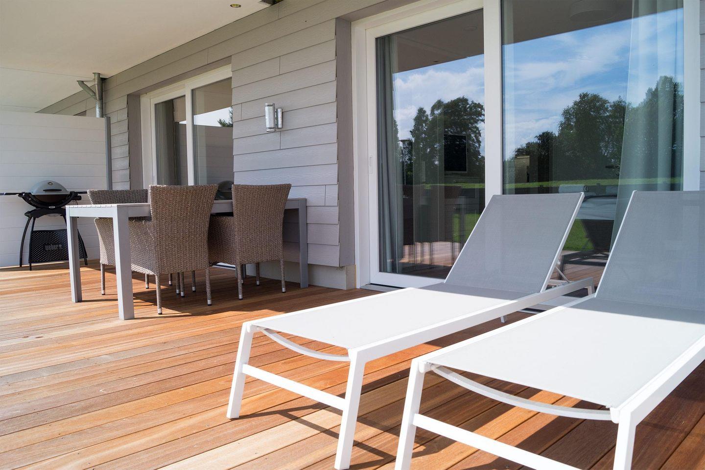 Moderne, helle Ferienwohnung mit Kamin und Terrasse, Sauna im Haus