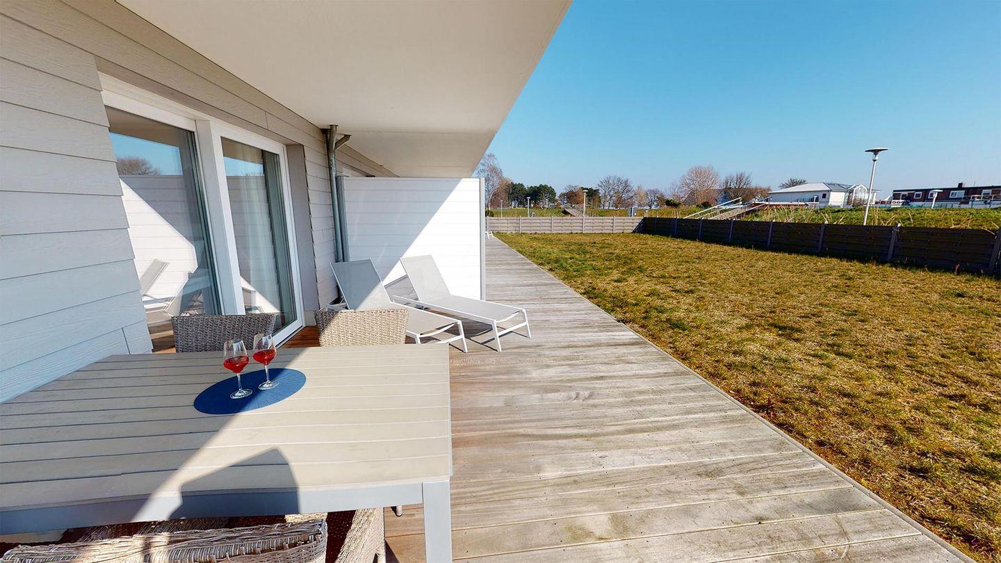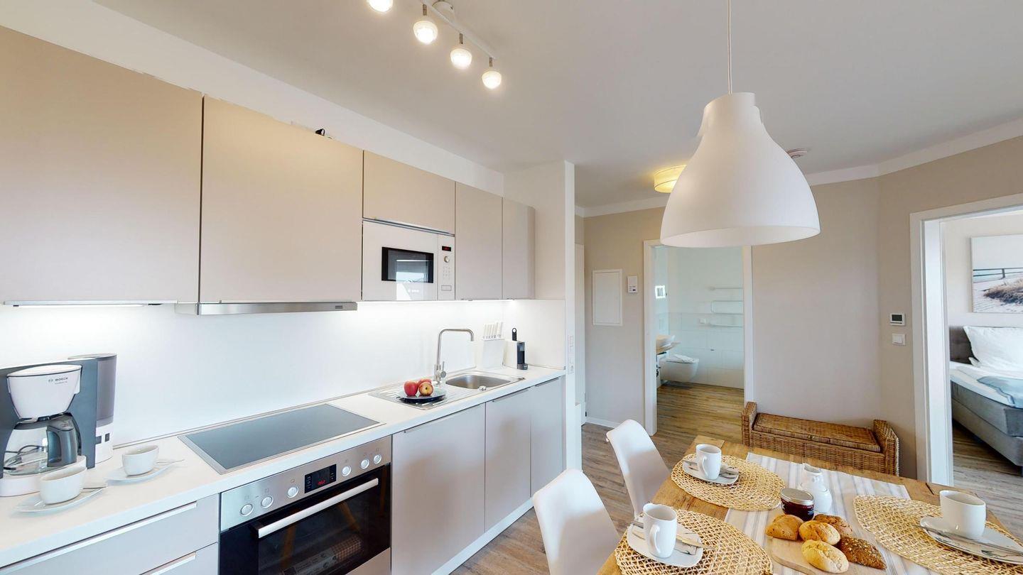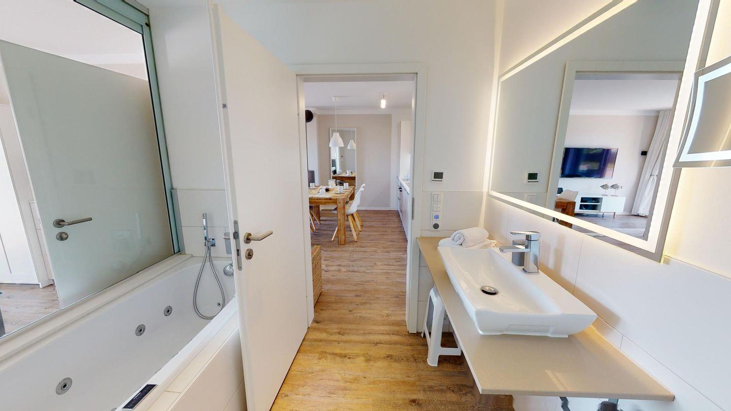 Im Erdgeschoss des Ferienobjekts Beach'n'Sea gelegen. Voll ausgestattete Küche, Ess- und gemütlicher Sofabereich mit Kaminofen. Schönes Schlafzimmer mit hochwertigem Boxspringbett, Verdunklungsplissees und Flachbildfernseher. Wellness-Badezimmer mit großer Dusche und Whirlwanne, beleuchtetem Wand- und Kosmetikspiegel, Wandradio mit Bluetooth-Verbindung und Fön. Große Terrasse mit modernem Gas-Grill (Gasflaschen werden von uns gestellt) und Terrassenmöbeln.