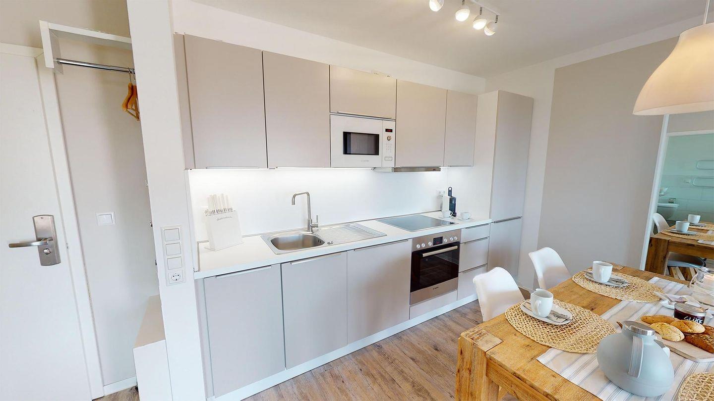 Diese helle, 2-Zimmer-Ferienwohnung bietet Platz für 2 Personen und verfügt über ein Schlafzimmer, ein Vollbad, ein Wohnzimmer mit offener Küche und eine große Terrasse.