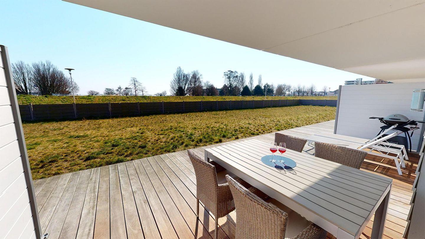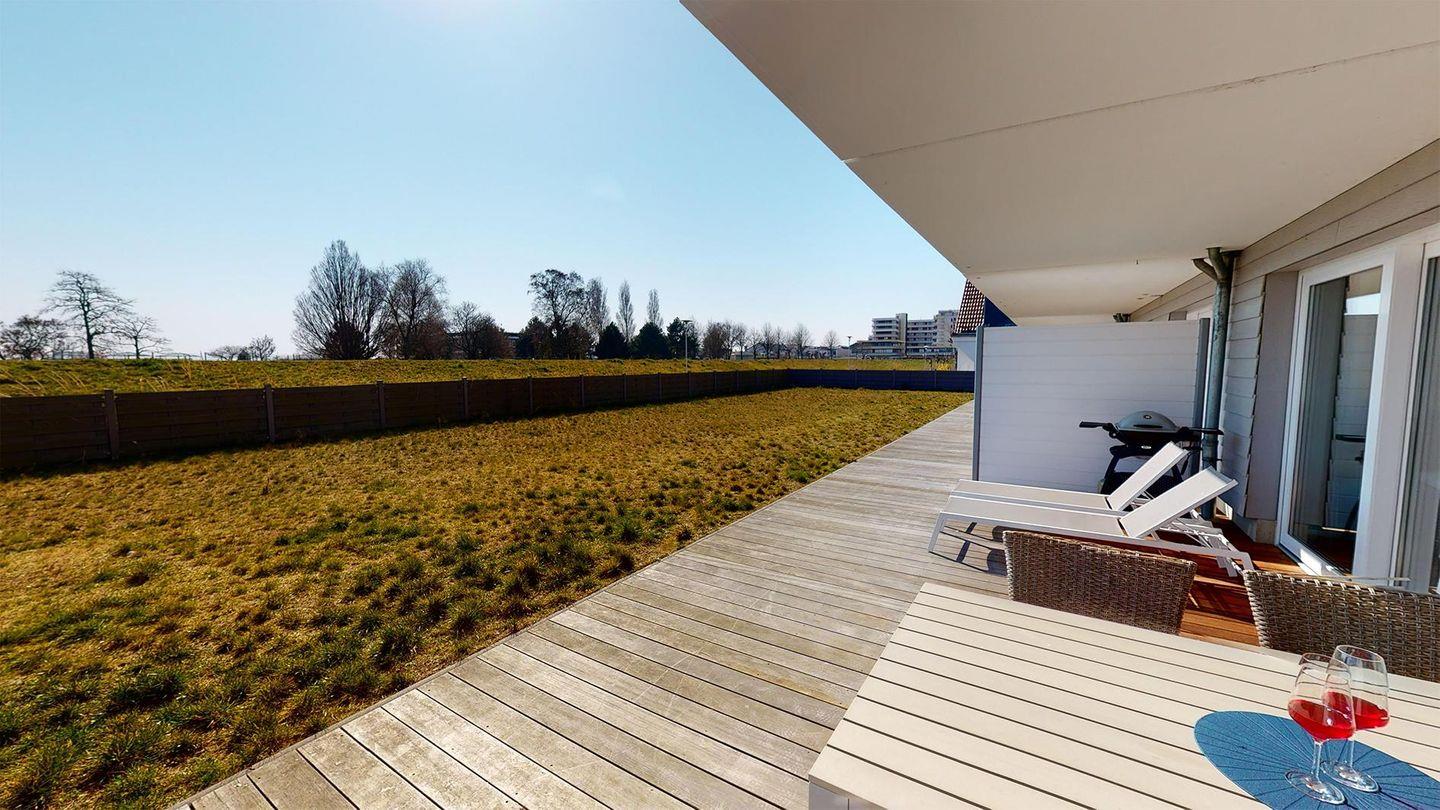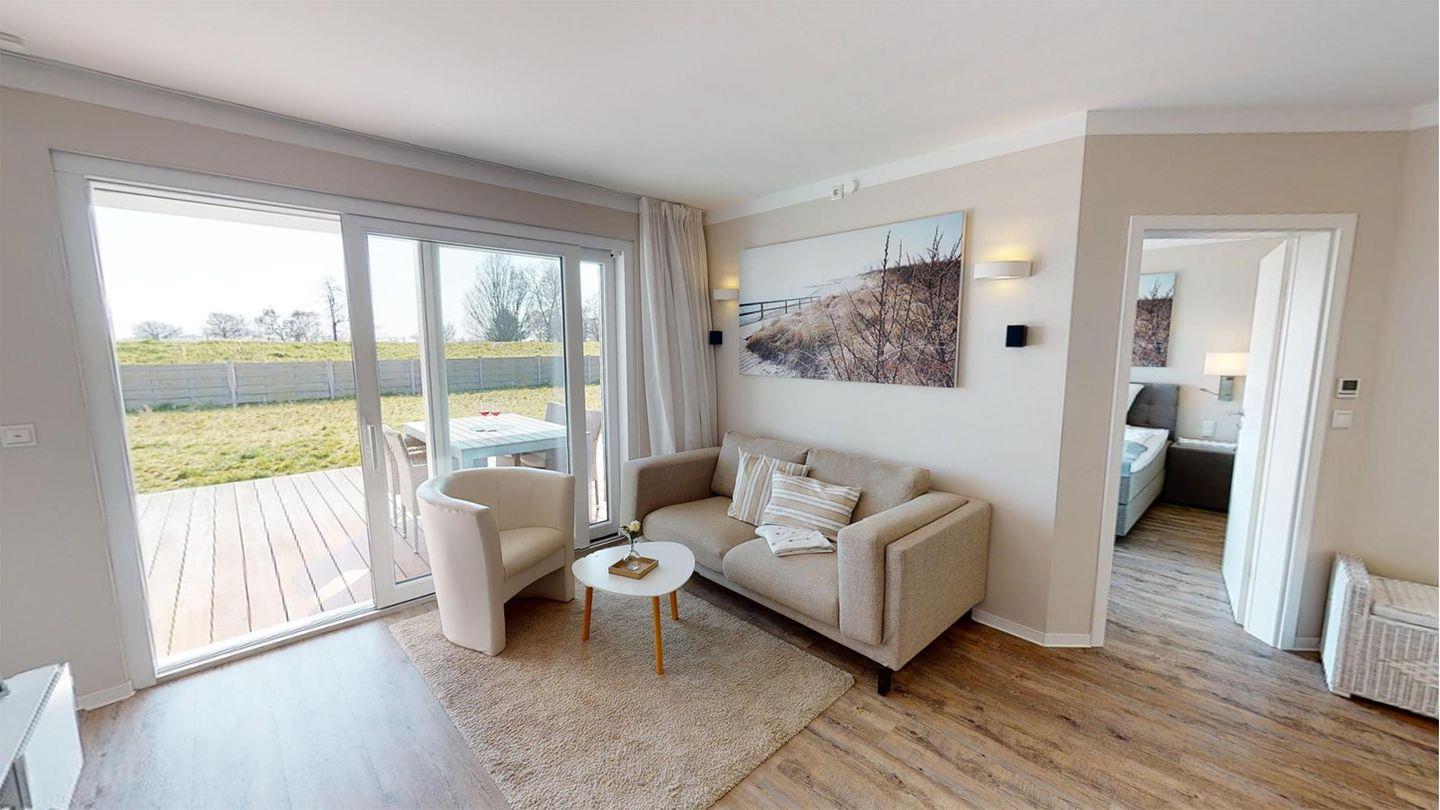 Helle Ferienwohnung am Deich in Grömitz mit Sauna, Kamin und großer Terrasse für entspannte Tage.