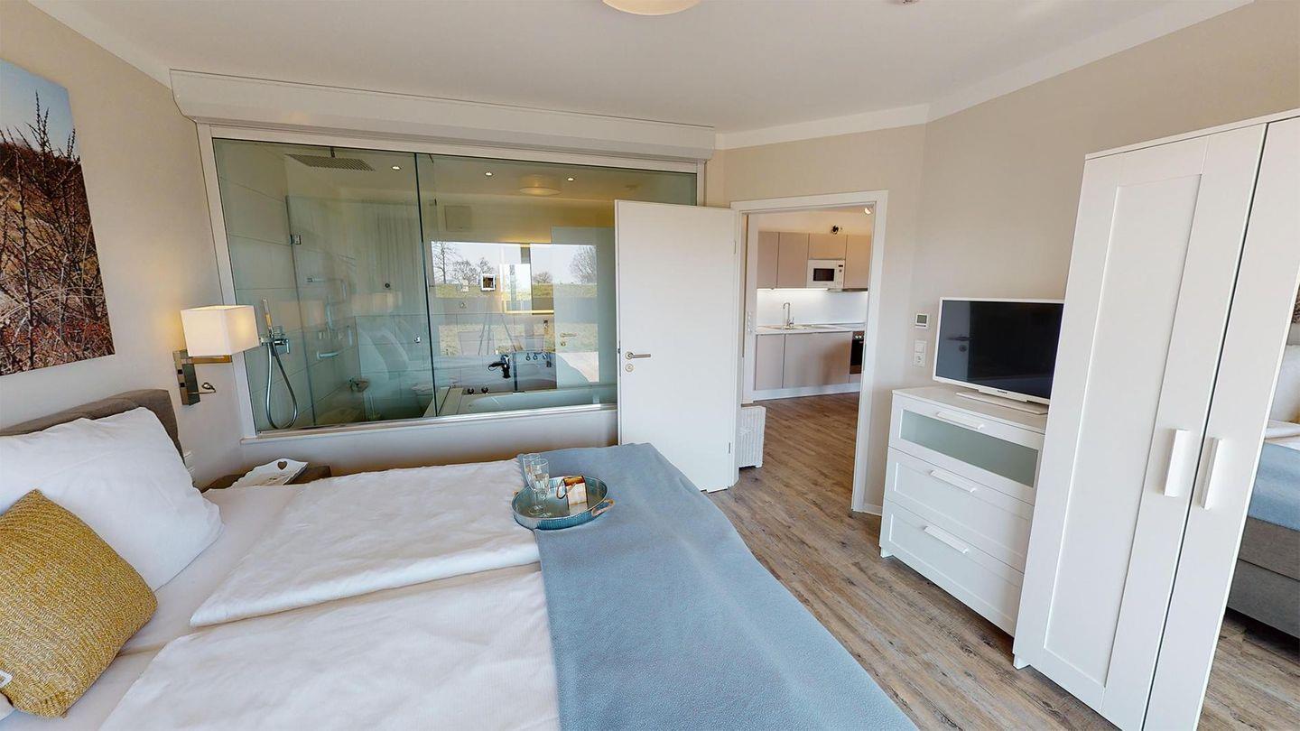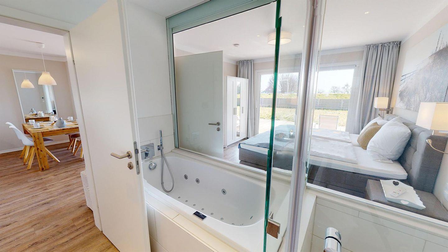 Im Wohnzimmer lädt ein gemütlicher Sofabereich mit Kaminofen und ein großer Flachbildfernseher zum Entspannen ein. Das kuschelige Schlafzimmer verfügt über ein hochwertiges Boxspringbett und ein Flachbild-Fernseher, während das Badezimmer mit einer großen, bodengleichen Dusche mit Regenbrause, einer Whirlwanne, einem beleuchteten Wand- und Kosmetikspiegel und einem Fön ausgestattet ist. Die große Terrasse mit Terrassenmöbeln und modernem Gas-Grill (Gasflaschen werden bereitgestellt) ist sowohl vom Wohnzimmer als auch vom Schlafzimmer aus erreichbar.