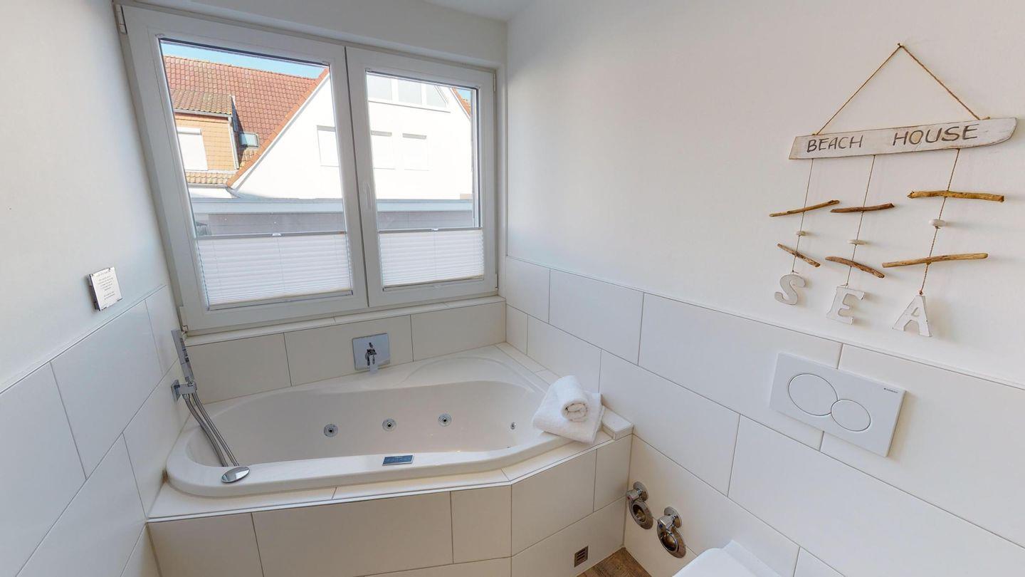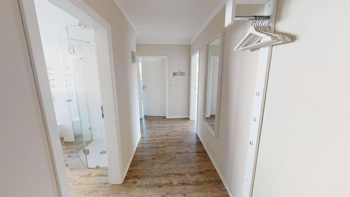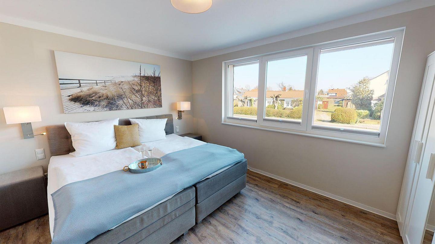 Die Wohnung befindet sich im Erdgeschoss der Beach'n'Sea Anlage. Zwei Schlafzimmer erwarten Sie mit gemütlichen Boxspringbetten, Verdunkelungsplissees und Flachbild-Fernsehern. Es gibt ein Duschbad mit bodengleicher Dusche und ein weiteres Duschbad mit zusätzlicher Whirlwanne. Beide Bäder sind mit beleuchteten Wand- und Kosmetikspiegeln, Wandradios mit Bluetooth-Verbindung und einem Fön ausgestattet.