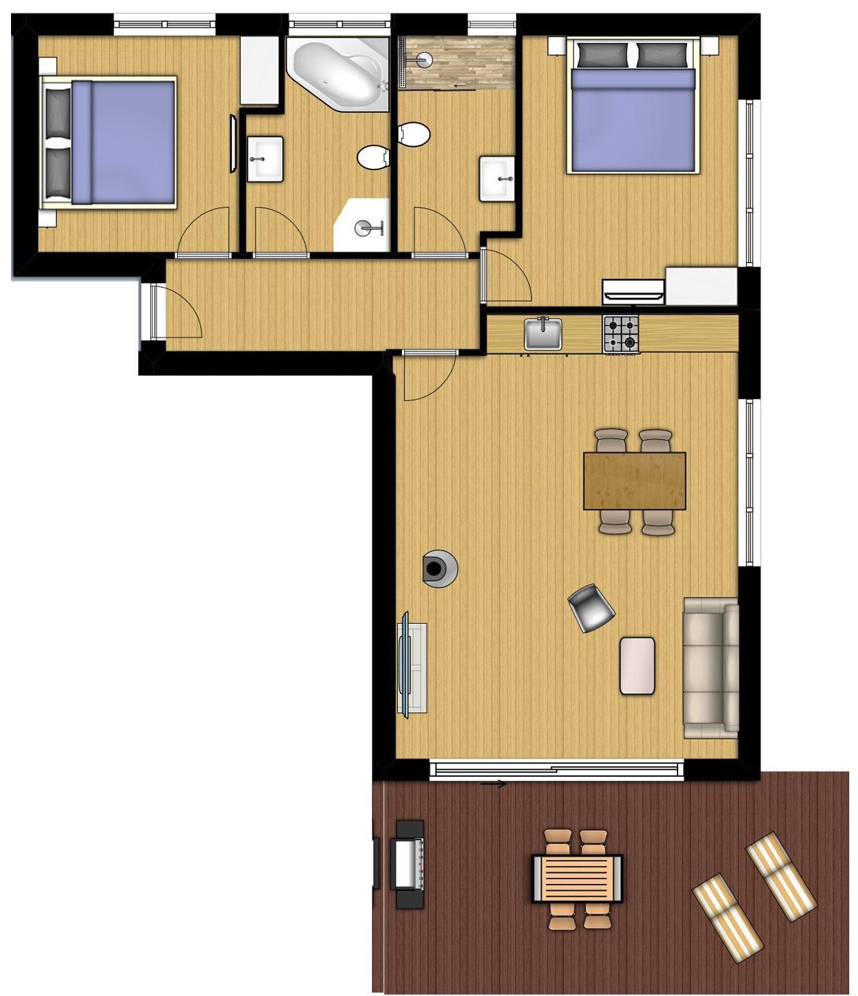 Modernes 90 m² Ferienapartment mit großer Terrasse – bietet Platz für 4 Personen. Privates Parken direkt an der Unterkunft.