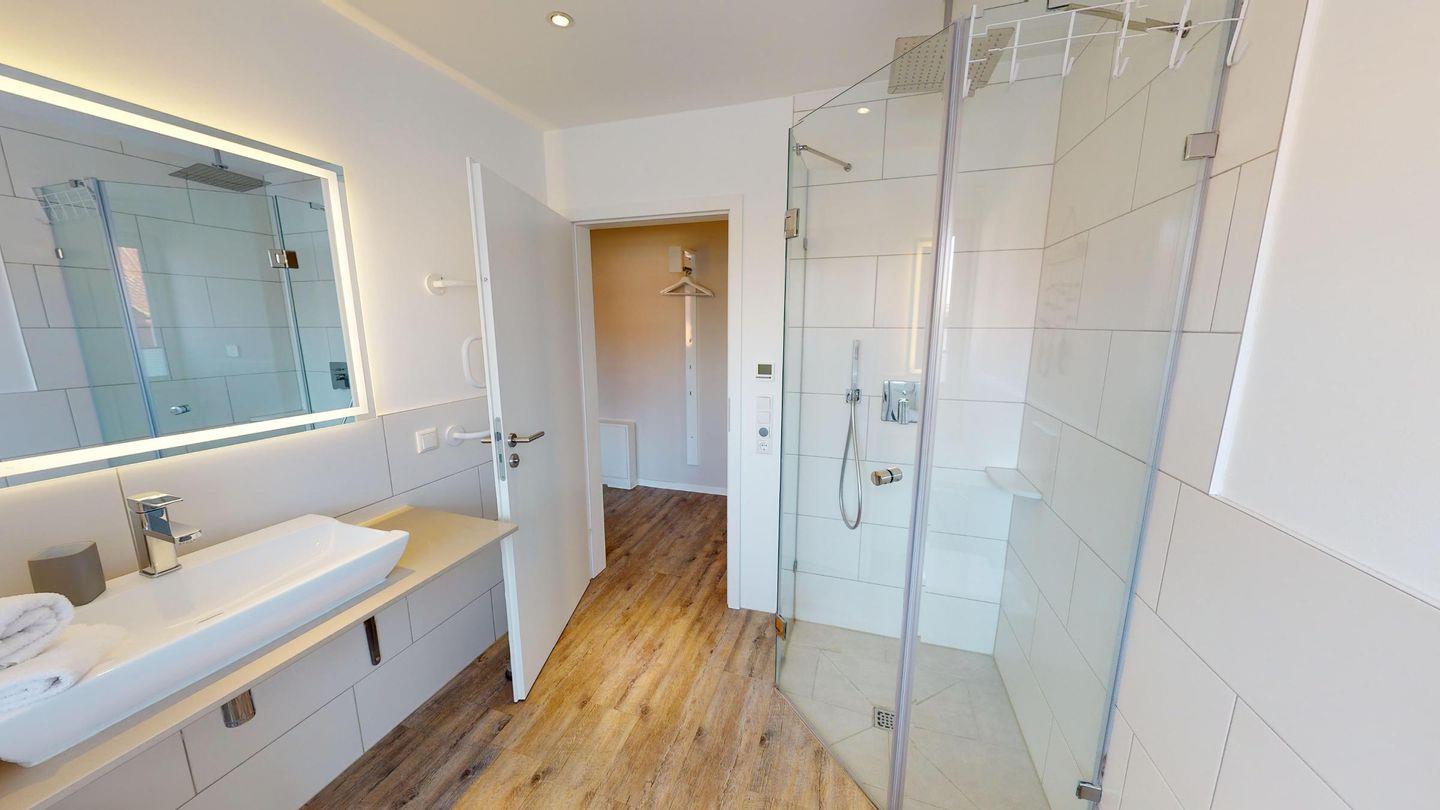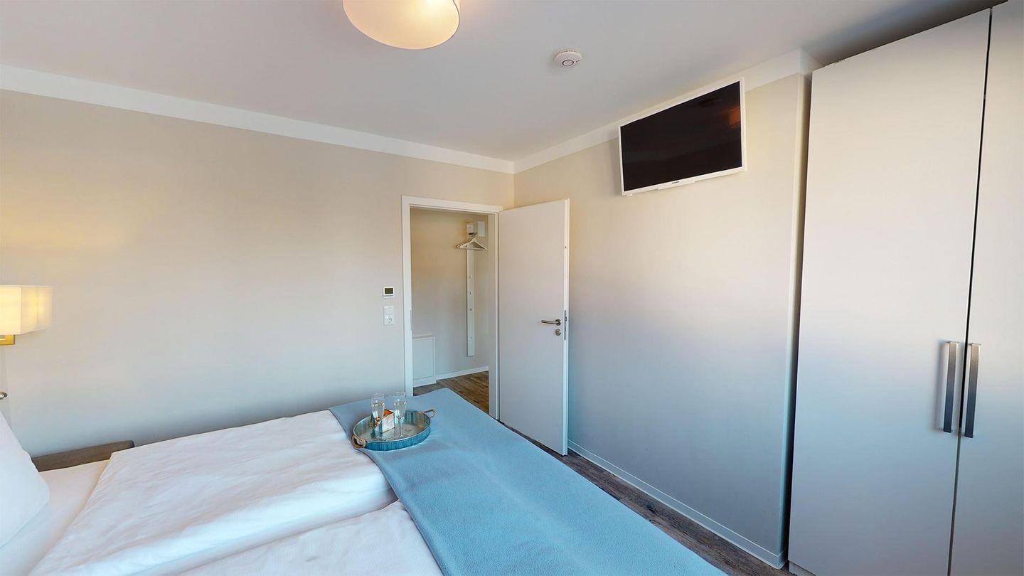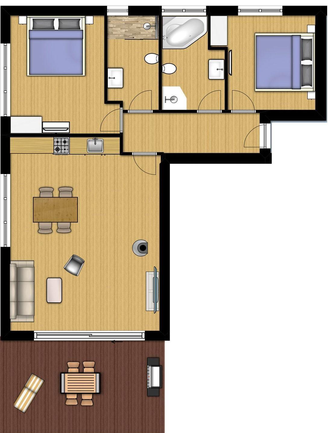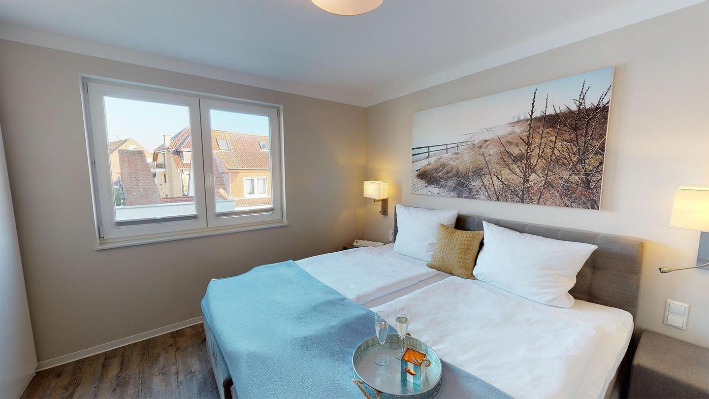 Die beiden Schlafzimmer sind mit hochwertigen Boxspringbetten (2 x 2 m) ausgestattet, inklusive Verdunklungsplissees und Flachbild-Fernsehern. Das Apartment verfügt über ein Duschbad mit einer Regenbrause sowie ein weiteres Badezimmer mit einer Whirlwanne. In beiden Bädern finden sich beleuchtete Wand- und Kosmetikspiegel sowie Wandradios mit Bluetooth-Verbindung. Das Wohnzimmer zeichnet sich durch seine Helligkeit aus, während die voll ausgestattete Küche zum Genießen einlädt. Ein Essbereich und ein gemütlicher Sofabereich mit Kaminofen vervollständigen den Wohnraum.