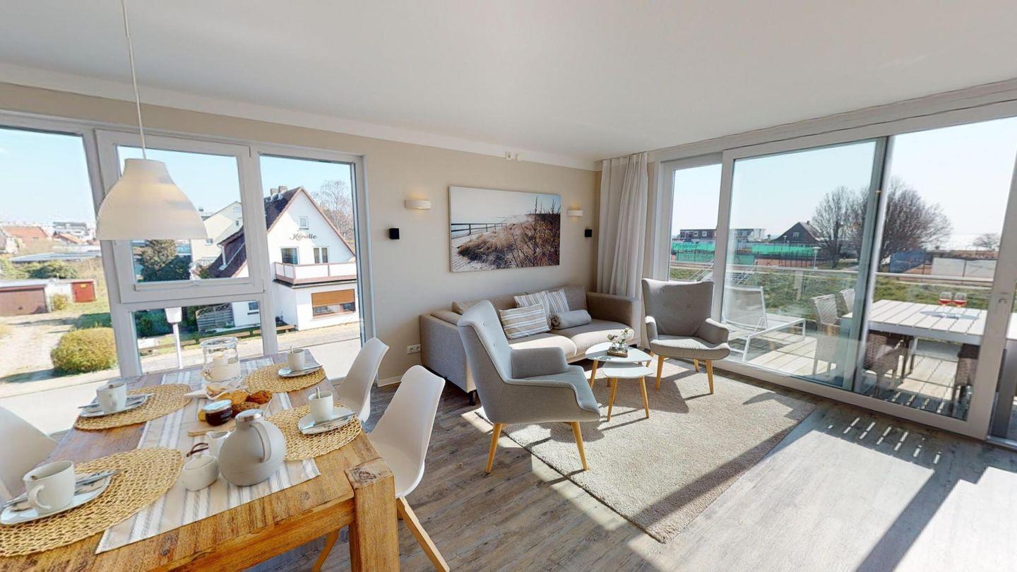 Die beiden Schlafzimmer sind mit hochwertigen Boxspringbetten ausgestattet, inklusive Verdunklungsplissees und Flachbildfernsehern. Das Apartment verfügt über ein Duschbad mit einer Regenbrause sowie ein weiteres Badezimmer mit einer Whirlwanne. In beiden Bädern finden sich beleuchtete Wand- und Kosmetikspiegel sowie Wandradios mit Bluetooth-Verbindung. Das Wohnzimmer zeichnet sich durch seine Helligkeit aus, während die voll ausgestattete Küche zum Genießen einlädt. Ein Essbereich und ein gemütlicher Sofabereich mit Kaminofen vervollständigen den Wohnraum.