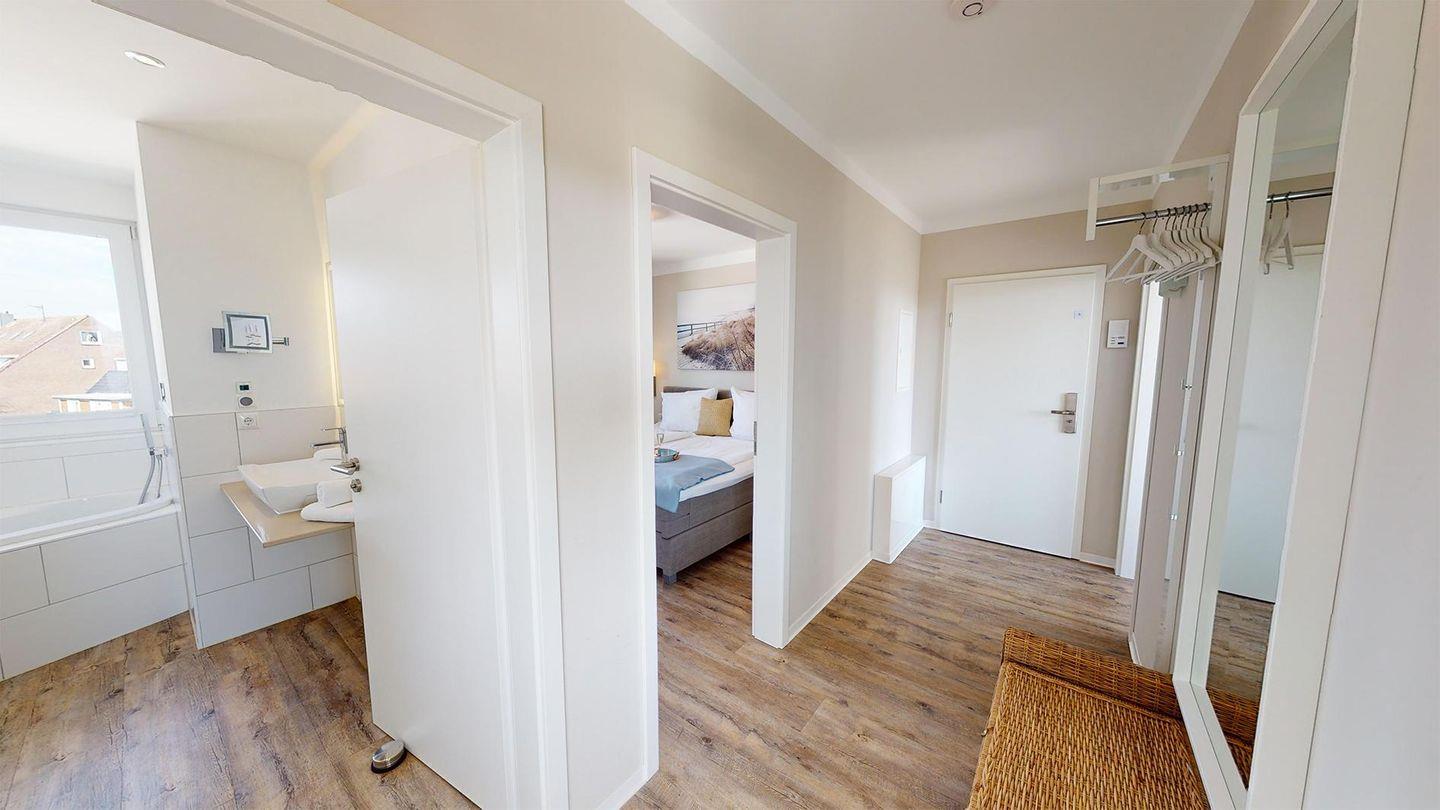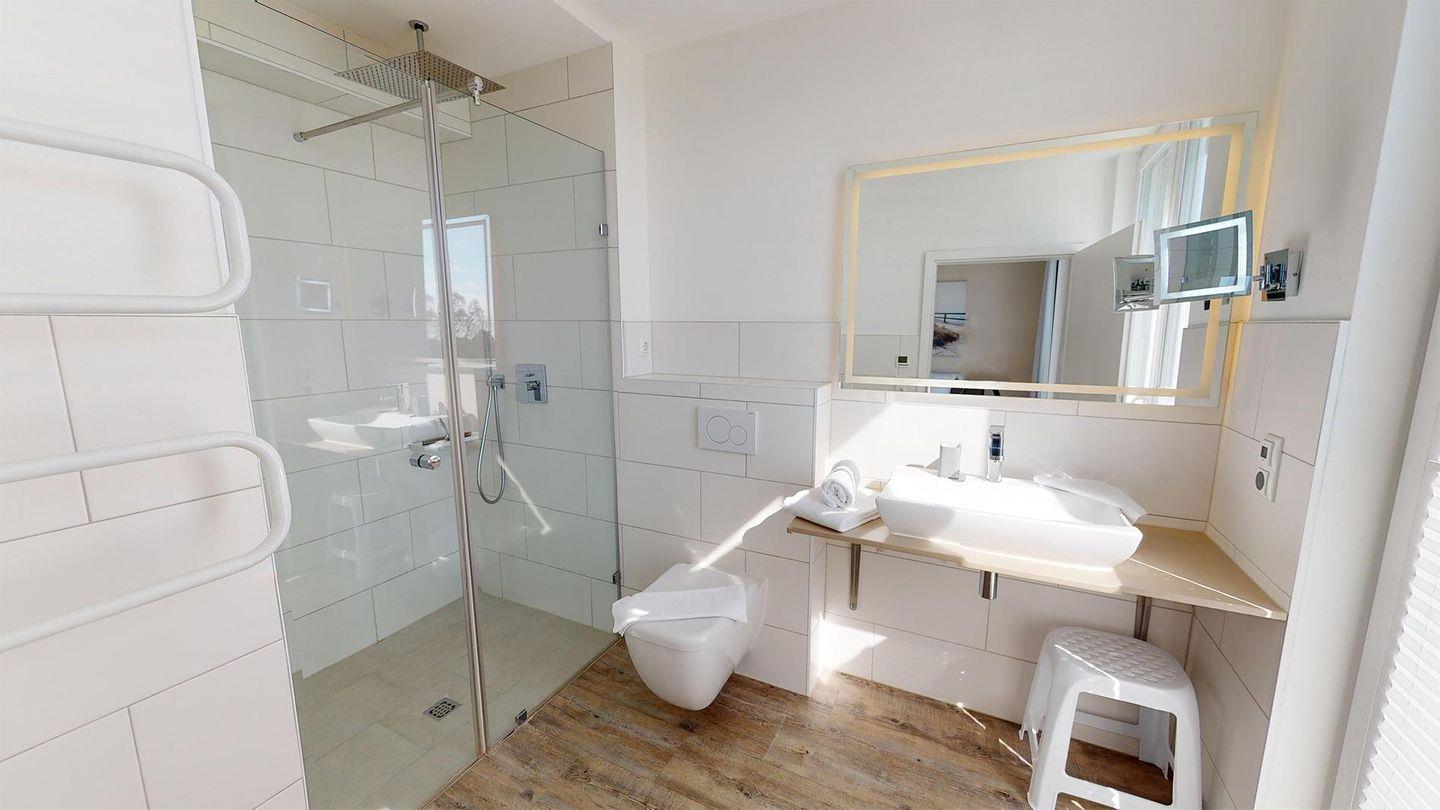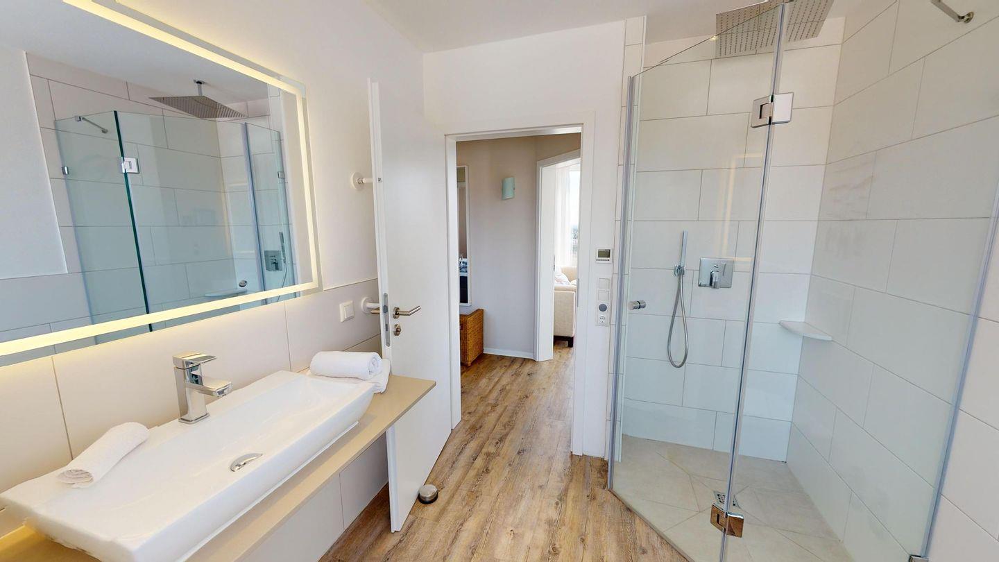 Die drei Schlafzimmer sind mit hochwertigen Boxspringbetten ausgestattet, inklusive Verdunklungsplissees und Flachbildfernsehern. Zwei Duschbäder mit Regenbrause erreichen Sie über die jeweiligen Schlafzimmer. Das dritte Duschbad mit Regenbrause und Whirlwanne ist über den Flur erreichbar. Alle drei Bäder sind mit beleuchteten Wand- und Kosmetikspiegeln sowie Wandradios mit Bluetooth-Verbindung ausgestattet.