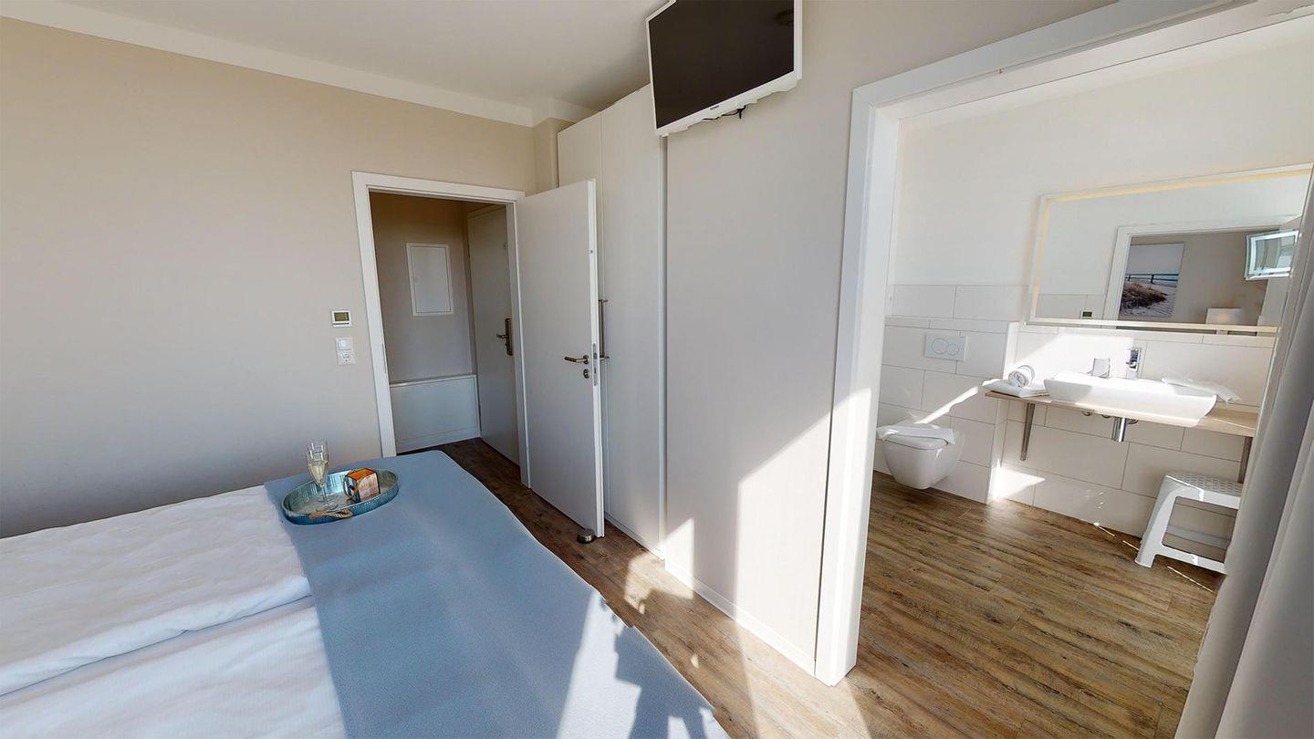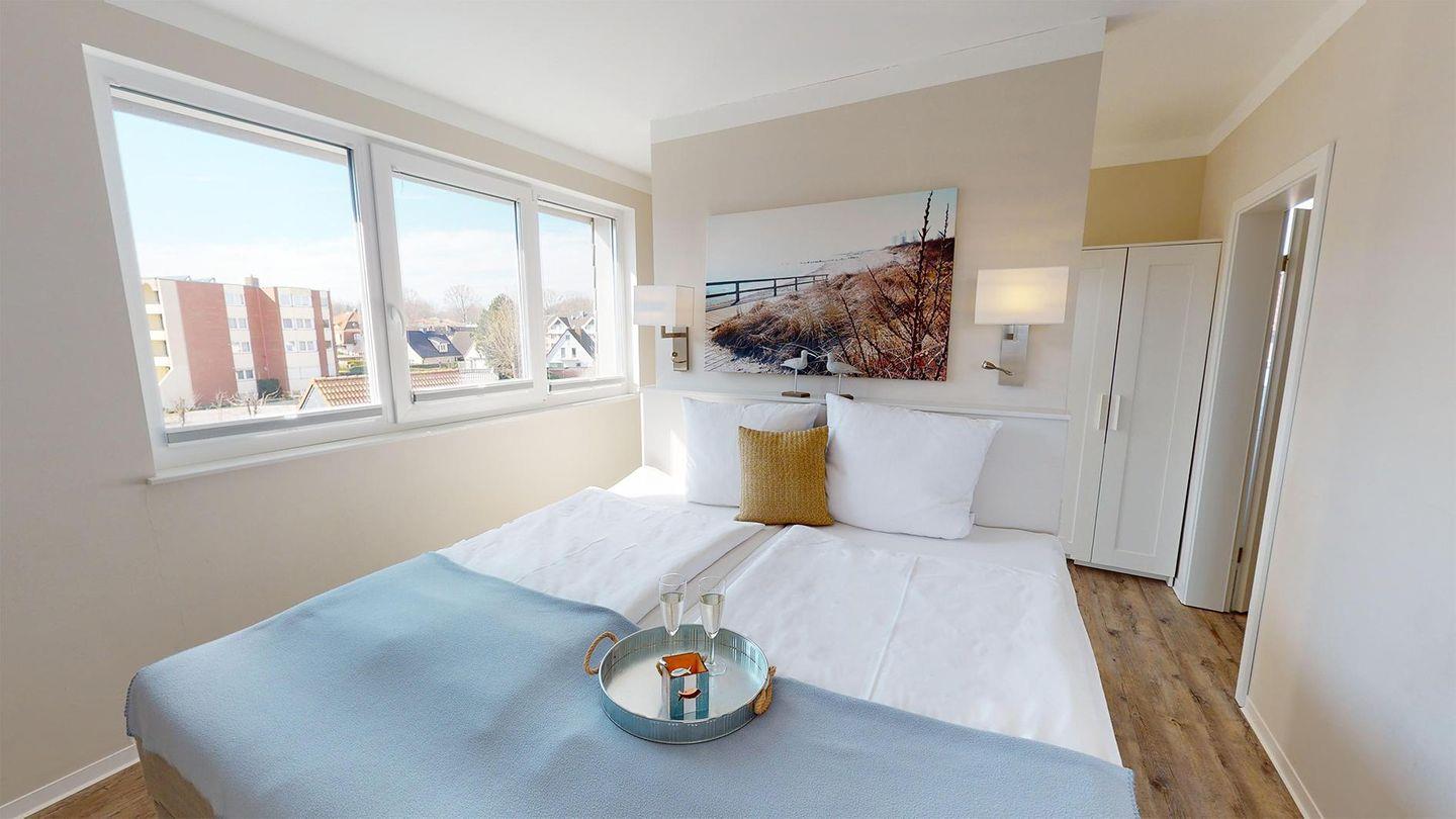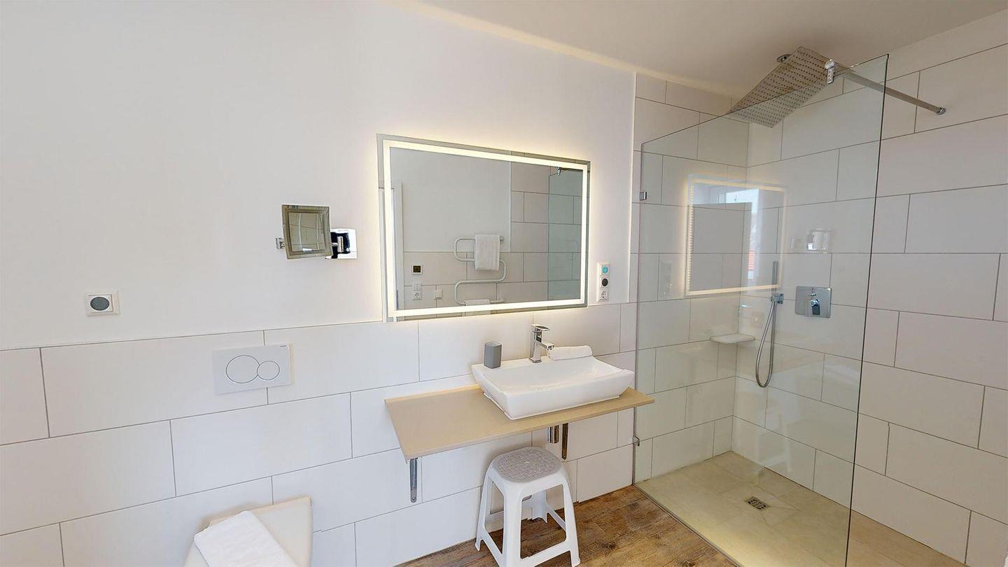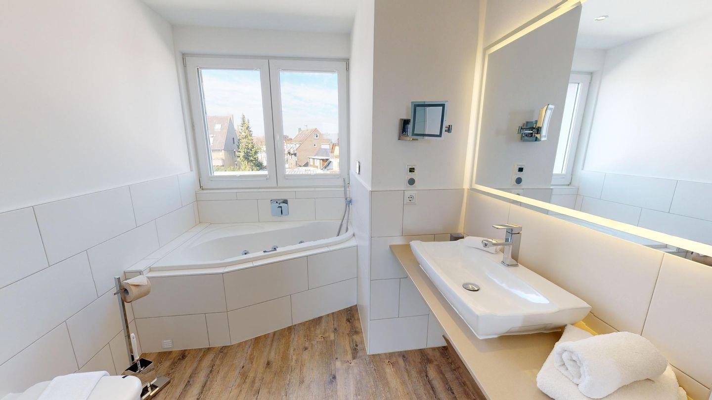 Die drei Schlafzimmer sind mit hochwertigen Boxspringbetten ausgestattet, inklusive Verdunklungsplissees und Flachbildfernsehern. Zwei Duschbäder mit Regenbrause erreichen Sie über die jeweiligen Schlafzimmer. Das dritte Duschbad mit Regenbrause und Whirlwanne ist über den Flur erreichbar. Alle drei Bäder sind mit beleuchteten Wand- und Kosmetikspiegeln sowie Wandradios mit Bluetooth-Verbindung ausgestattet.
