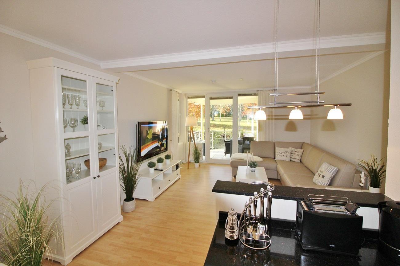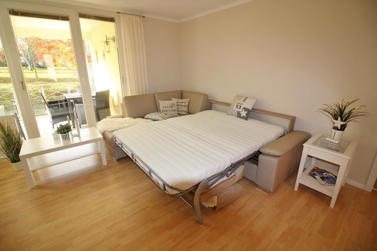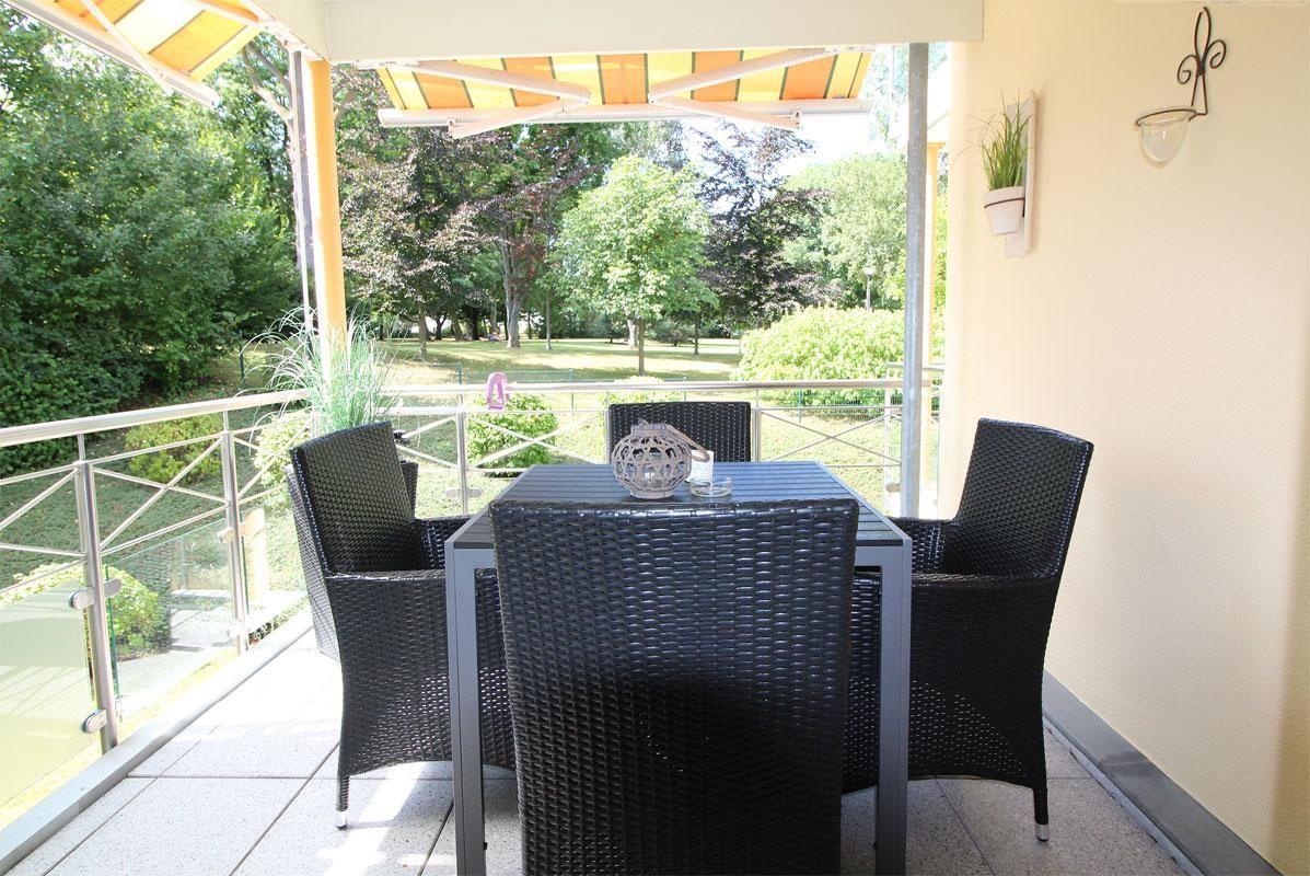 Das liebevoll im Landhausstil eingerichtete 2-Zimmer Appartement bietet Ihnen auf 54 m² Platz für 3 Personen plus Baby/Kleinkind bzw. 2 Erwachsene und 2 Kinder. Es besteht aus einem großzügigen Wohn-Essbereich, Schlafzimmer mit großem Kleiderschrank, Duschbad mit Fußbodenheizung, Flur und einer voll ausgestatteten Nolte-Küche. Auf dem hochwertigen Ledersofa können zwei Erwachsene sehr bequem liegen und entspannen. Die integrierte Schlaffunktion (1,50 m Breite) mit stabilem Lattenrost lässt sich leicht und schnell öffnen und das Bettzeug direkt unter der aufklappbaren Ottomane verstauen. Vom Balkon in Süd-/West-Lage haben Sie einen traumhaften Panorama-Blick direkt in den Kurpark - zu jeder Jahreszeit eine Augenweide! Sie können die Wohnung in der 1. Etage auch bequem mit dem Fahrstuhl erreichen.
