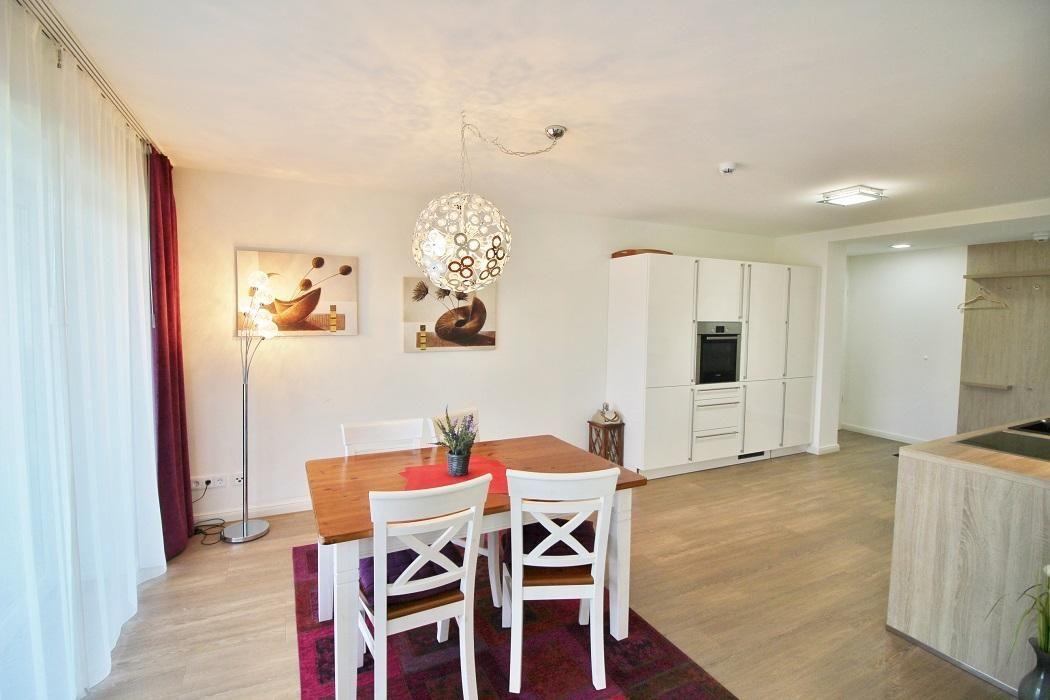 Im großzügigen Essbereich befindet sich ein Esstisch für 4 Personen.
