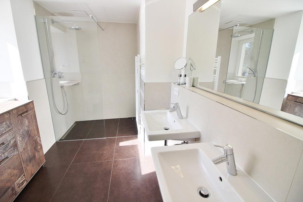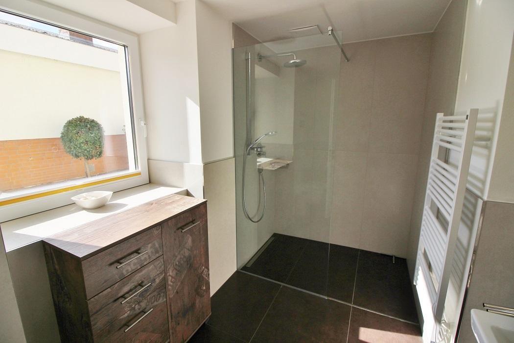 Das Duschbad mit seiner bodentiefen Regendusche ist gefliest und bietet genug Platz für die persönlichen Dinge, zusätzlich befindet sich im Flurbereich ein Gäste-WC.