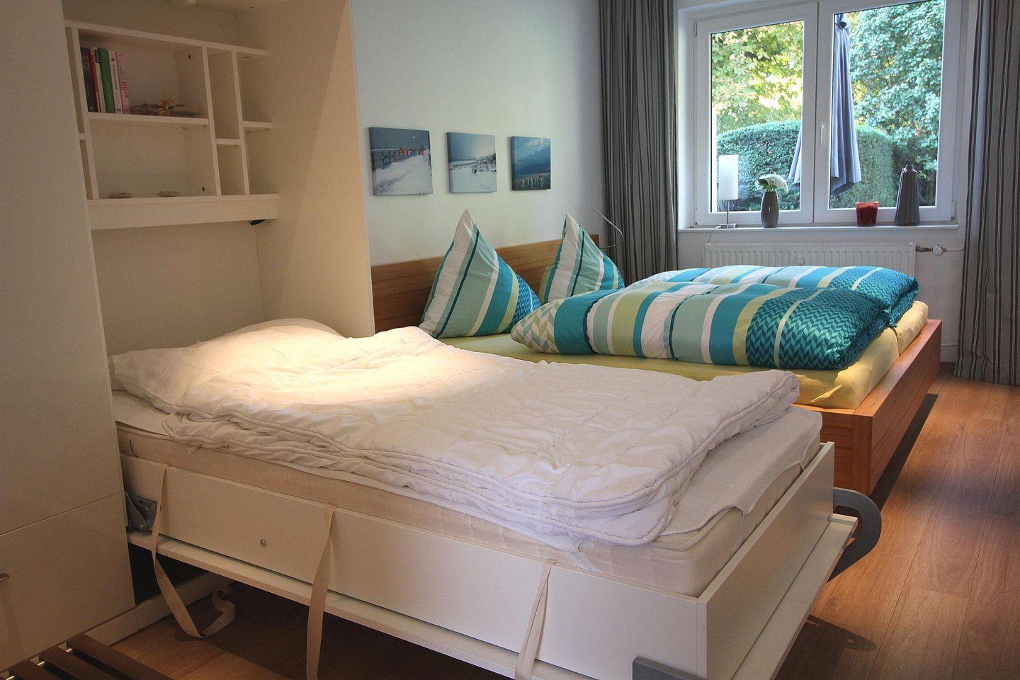 Im Schlafzimmer befindet sich ein Doppelbett sowie ein Einzelschrankbett.