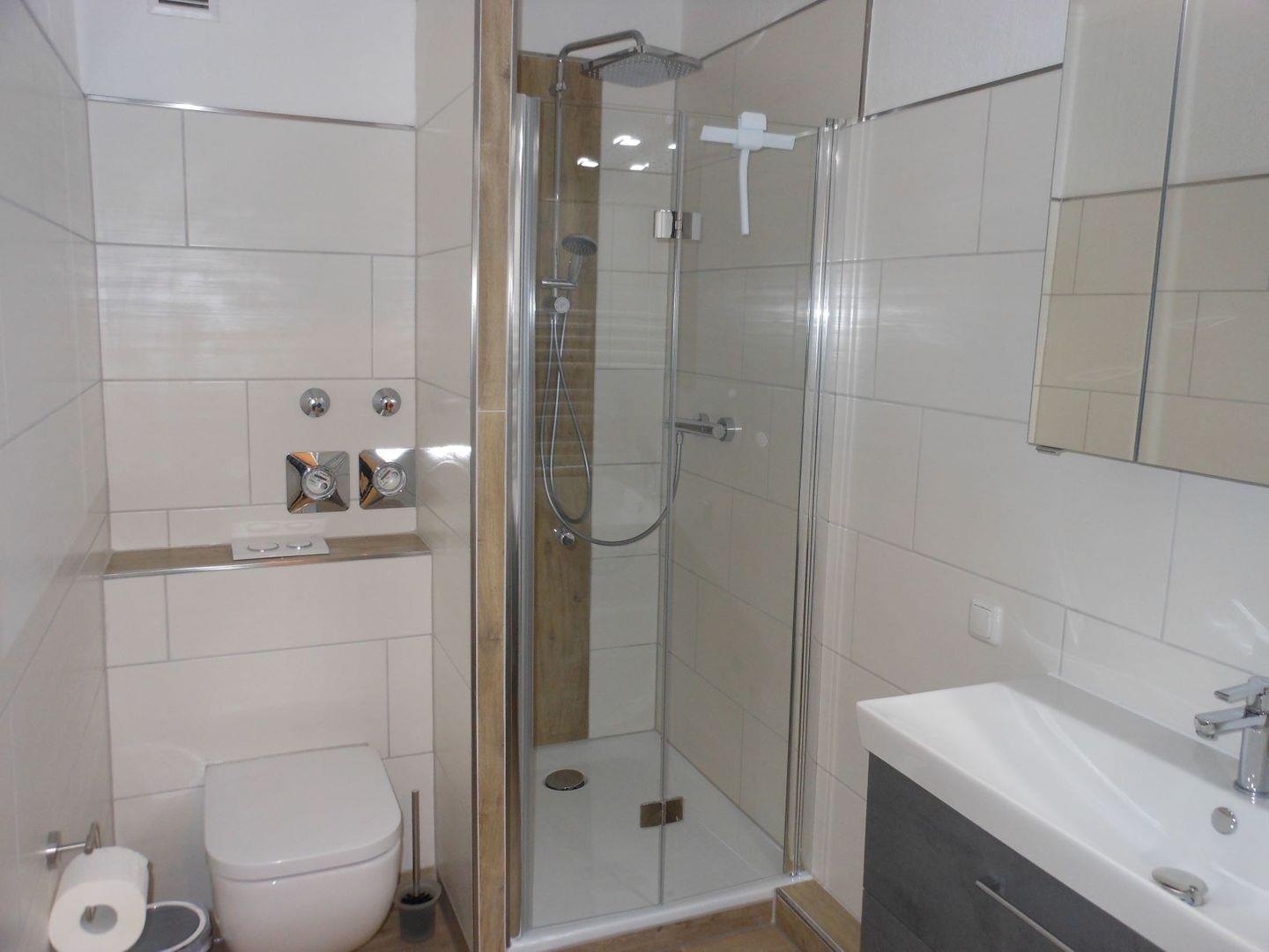 Das geräumige Duschbad ist mit einer Dusche und 2 Waschbecken ausgestattet.