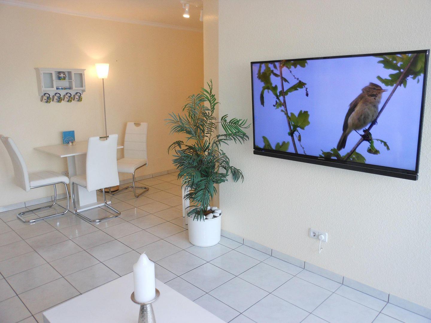 Das Wohnzimmer mit seiner offenen Küche ist mit einer Couch (gleichzeitig Schlafcouch), Sessel, einem Esstisch für 3 Personen und Anrichte ausgestattet. Zur Unterhaltung stehen ein Flach-TV 55 Zoll und ein Radio bereit. Die offene Küchenzeile ist mit einer kleinen Tischgeschirrspüle, Ceranfeldherd, Backofen und Kühlschrank ausgestattet.
