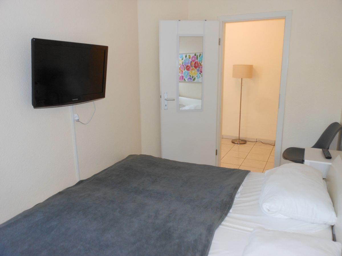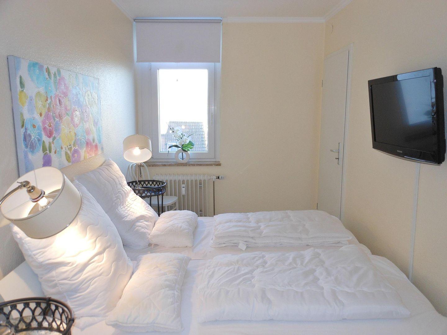 Im Schlafzimmer befinden sich ein bequemes Doppelbett in der Größe 2 x 90×200. Beide Bettseiten sind durch Türen zu erreichen, Ein Flach-TV in 32 Zoll ist dort angebracht.