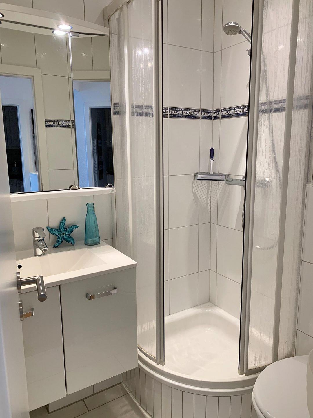 In dem kleinen, gepflegten Duschbad/WC finden Sie ausreichend Platz und Stauraum für Ihre Utensilien, sowie Fön und Handtuch-Heizkörper.