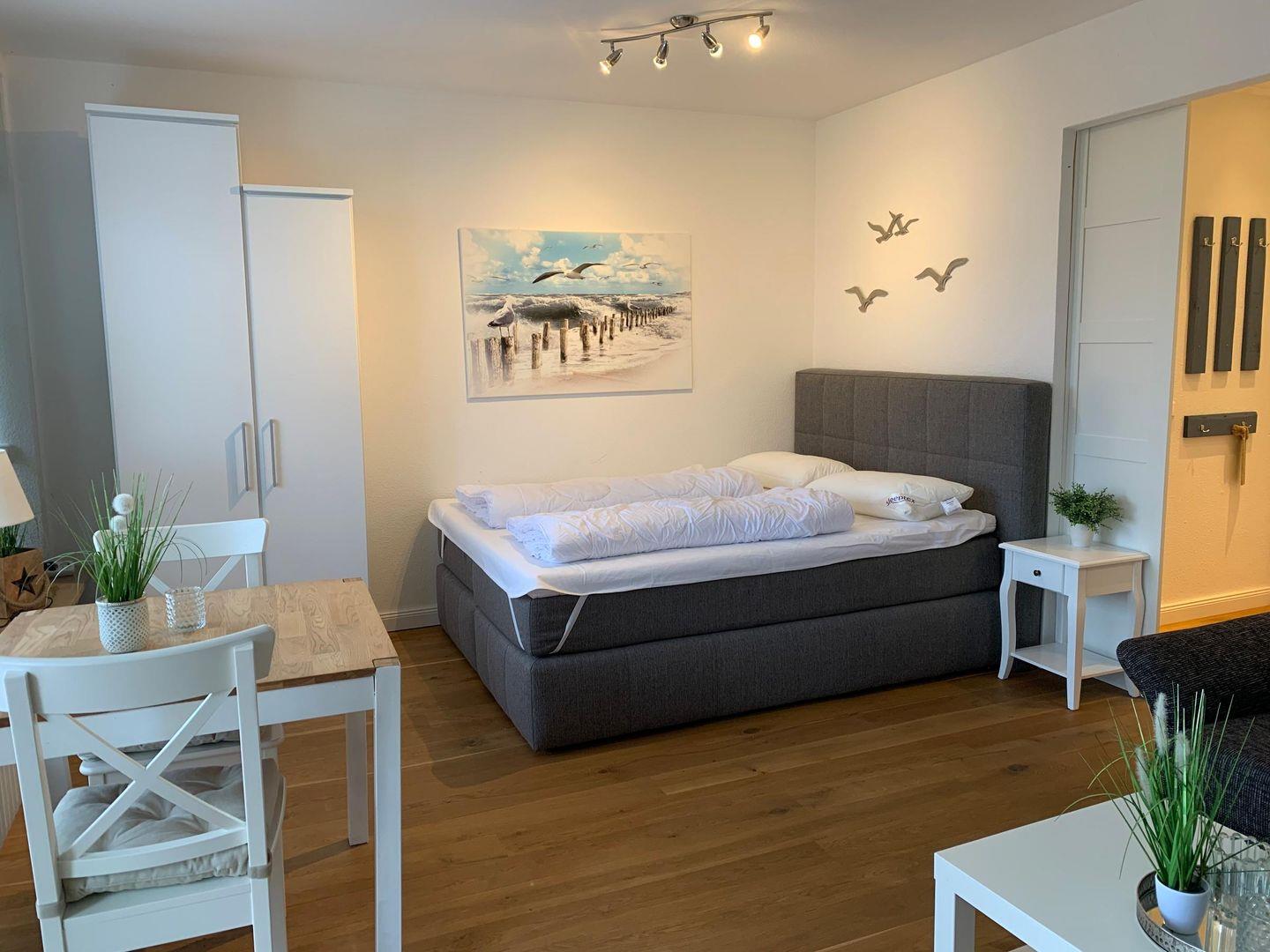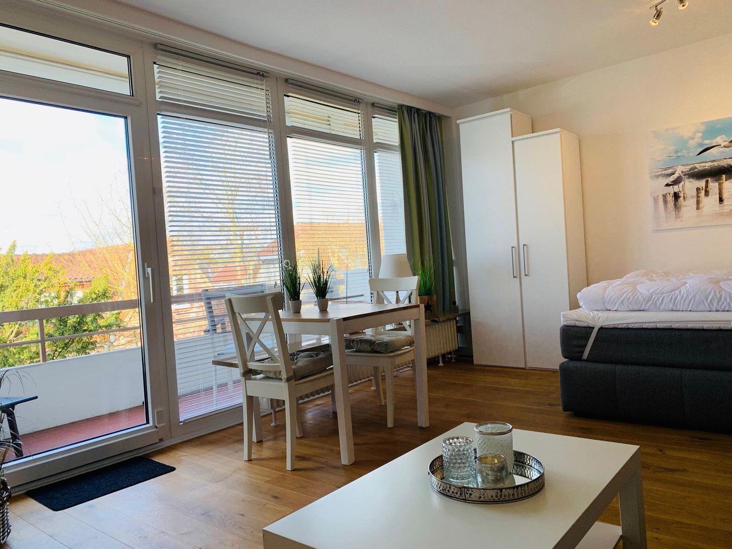 Die liebevoll und modern eingerichtete Einzimmerwohnung mit Balkon im 1. OG im Haus Baltic in ruhiger Lage und einem ebenso schönen Ausblick in einen gepflegten Garten.