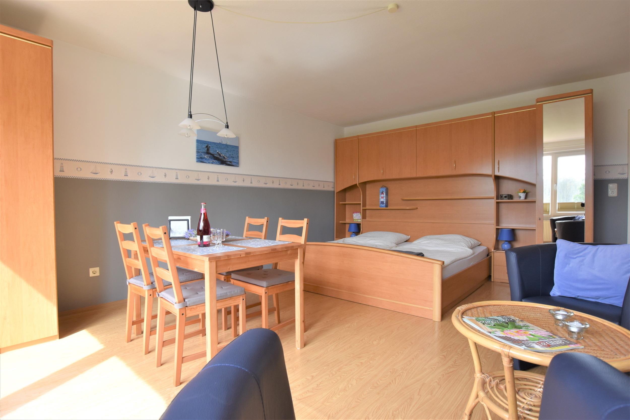 Das Wohn-/Schlafzimmer ist mit einem Doppelbett, einer gemütlichen Sitzecke sowie einem Essbereich versehen - von hier aus gelangen Sie auf den möblierten Balkon.