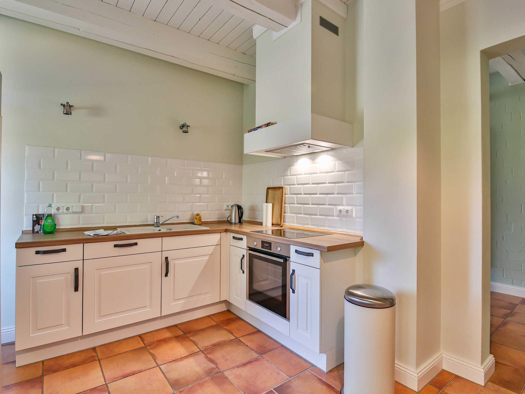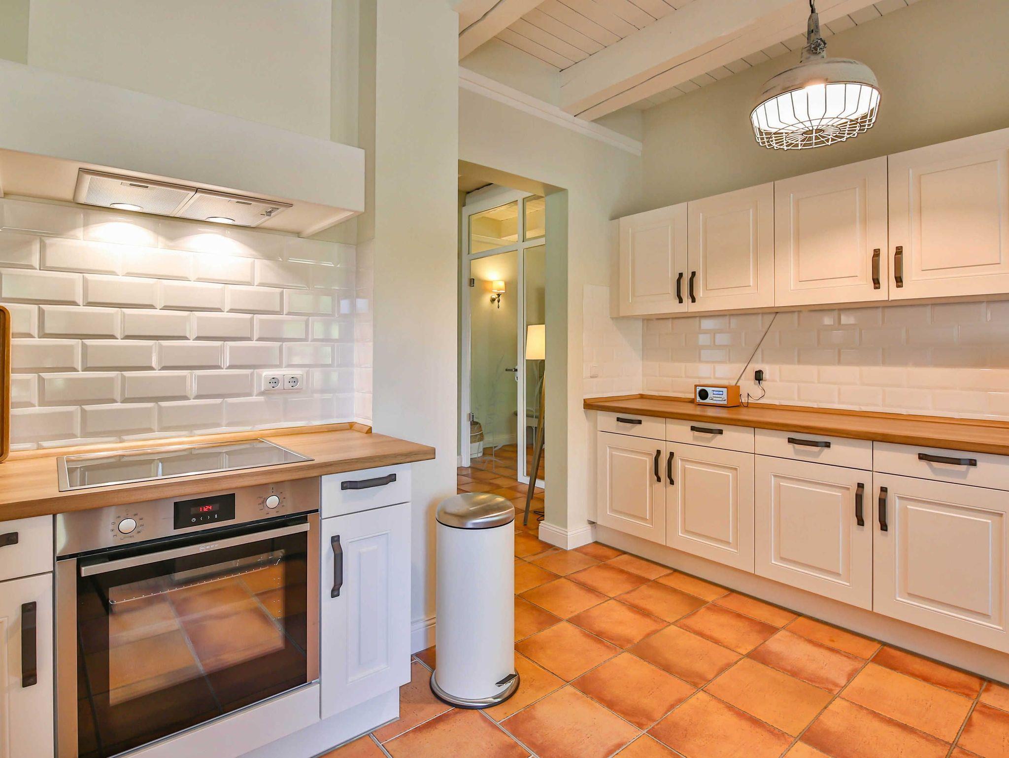 - Komplett eingerichtete Küche mit Ofen, Herd und Mikrowelle
