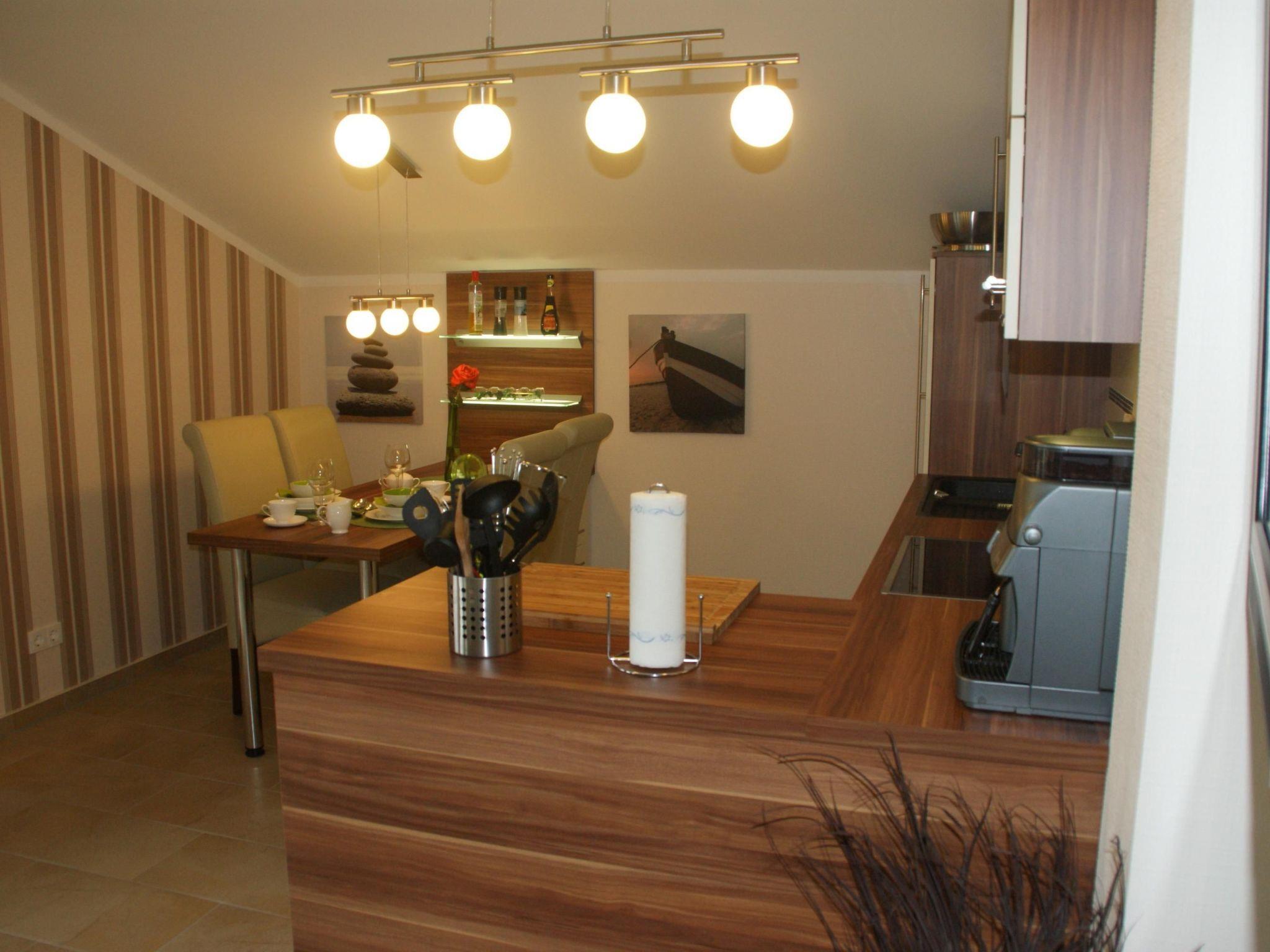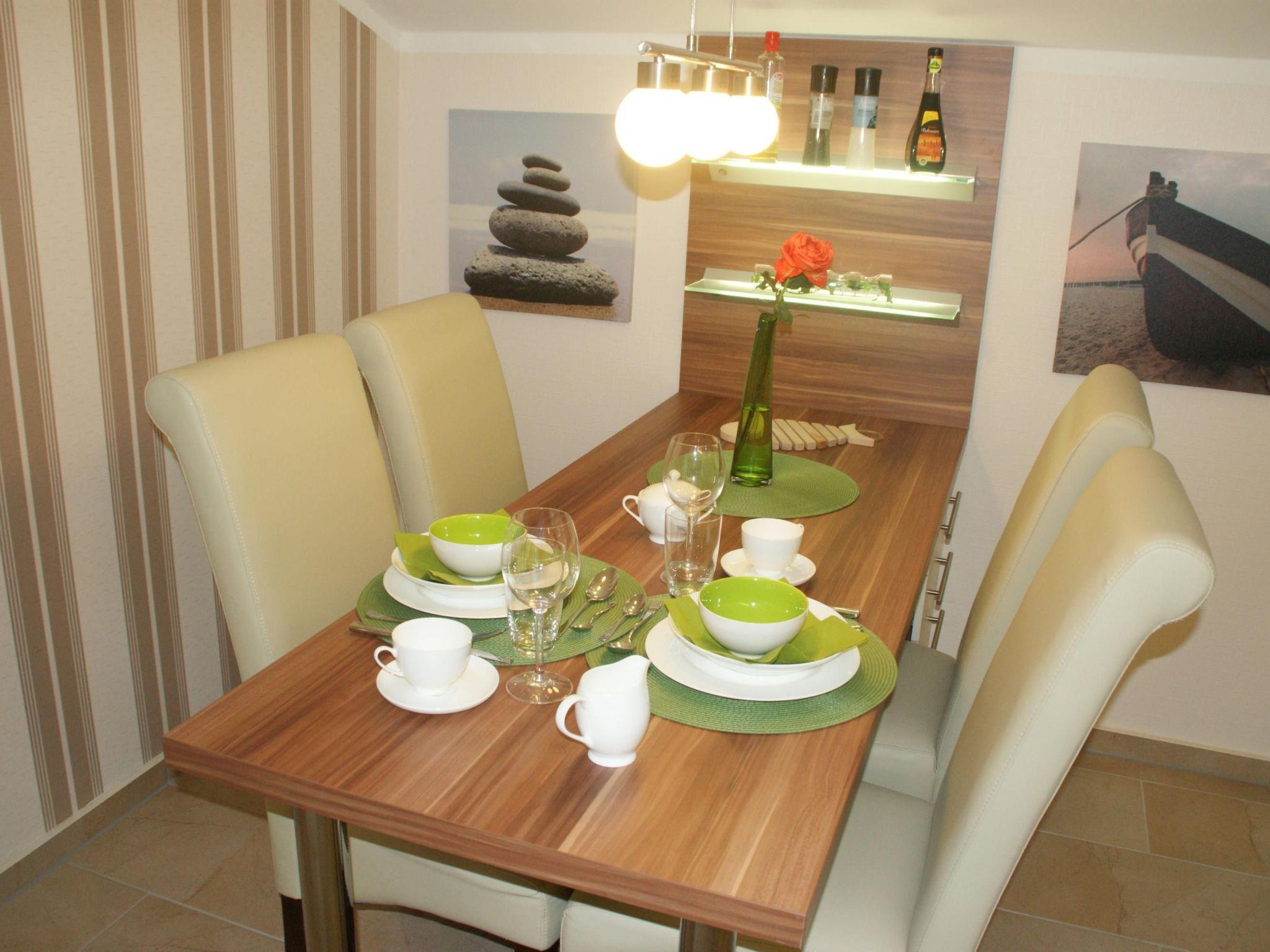 Die Ferienwohnung bietet Ihnen ein geräumiges Wohnzimmer mit gemütlichem Ledersofa und bester Technik. Die anschließende offene Küche lässt keine Wünsche offen. Vier Sitzplätze, Kühlschrank, Gefrierfach, Herd, Mikrowelle, Toaster, Kaffeemaschine, Wasserkocher, Kaffeevollautomat, genügend Geschirr, Mixer, Auflaufform, Püriertab, alles was ein Kochherz erfreut, finden Sie in hochwertiger Form vor. Die Wohnung hat zwei Balkone. Der größere von beiden grenzt an das Wohnzimmer und die Küche. Auf diesem Balkon gibt es vier Stühle, einen Esstisch, einen Beistelltisch für den Grill, eine Hollywoodschaukel für eine Person und zwei Sonnenschirme. Hier können Sie tagsüber die Sonne genießen. Die Wohnung bietet Ihnen zwei Schlafzimmer. Sie werden königlich schlafen, denn die vorhanden Betten sind ein Traum. Im größeren Schalfraum finden sie ein 200 x 200 cm großes Boxspringbett mit hochwertigen Matratzen. Ein hoher Einstieg und der weiche Topper auf dem großen Bett, lassen jeden Rücken strahlen vor Freude. In einem großen Kleiderschrank lässt sich Ihr Urlaubsgepäck wunderbar verstauen. Und am Abend, wenn vielleicht die Kinder schon schlafen, können Sie auf dem zweiten Balkon, ausgestattet mit zwei Korbstühlen und einem Tisch, bei einem Glas Wein die Abendsonne genießen. Das zweite Schlafzimmer bietet ebenfalls sehr hohen Komfort. Hier finden Sie zwei getrennt stehenden Boxspringbetten in der Grösse 100 x 200 cm. Auch hier werden Sie wunderbar träumen. Das Badezimmer bietet Ihnen einen Waschtich, ein WC, eine ebenerdige große Dusche, eine Waschmaschine und einen Trockner. Auch finden Sie für jeden Gast ein Duschtuch, zwei Handtücher, einen Waschlappen, Geschirrtücher, zwei Gästehandtücher und einen Badvorleger vor. Verbrauchsmittel für die ersten Tage sind im Preis enthalten (Spüli, Toillettenpapier, Küchenrolle, Geschirrspültaps usw.). In der Ferienwohnung "Meerestraum" werden Sie sich sicher sehr wohlfühlen, weil wir die Wohnung mit viel Liebe zum eingerichtet haben. Sie werden die Farben Ihres Urlaubes in den einzelnen Räumen harmonisch abgestimmt vorfinden: das Blau des Meeres, die Sandfarben des Strandes und das Grün der Bäume.