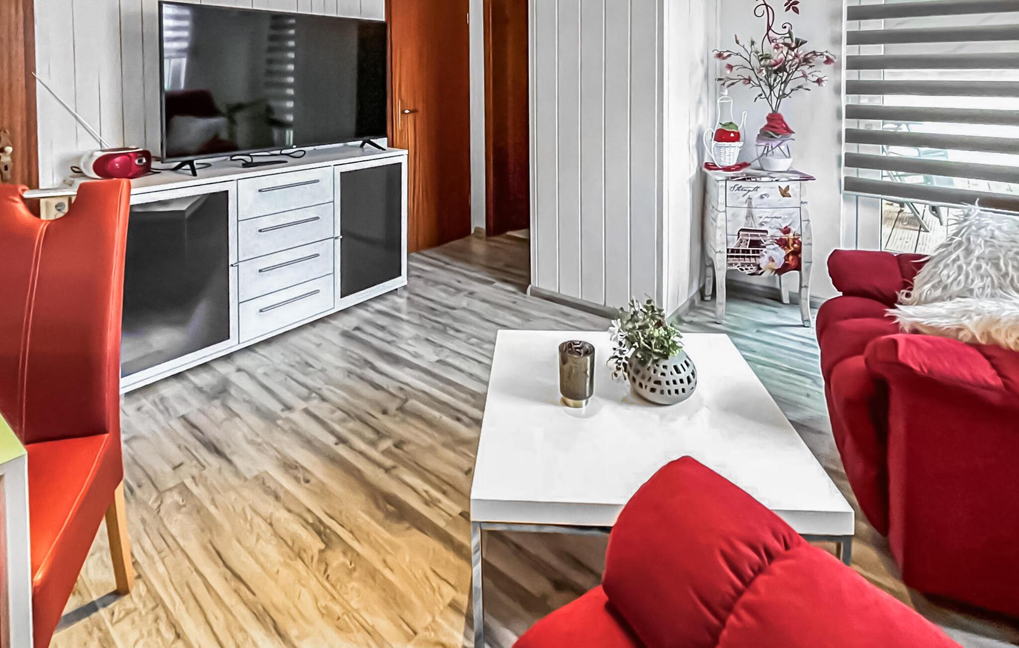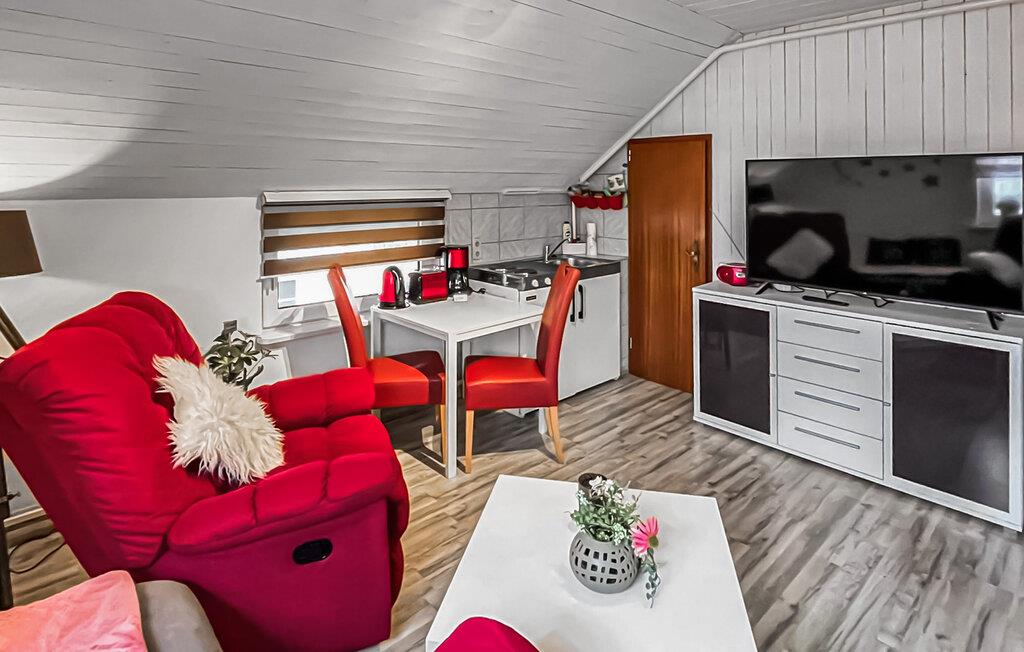 Die Ferienwohnung verfügt über einen Wohnraum (2 super bequeme Relaxsessel, großer Flachbild-TV, Radio/CD, Esstisch), eine offene Kochecke (E-Kochfeld, Kühlschrank mit Tiefkühlfach, div. Küchengeräte), ein Schlafraum (Doppelbett, Gästebett), ein Bad mit DU/WC. Für Kleinkinder können ein Kinderreisebett und ein Hochstuhl bereitgestellt werden.