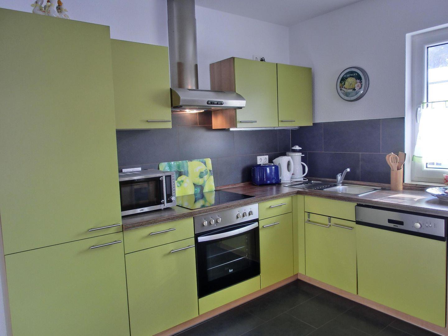 - offene Küche im Wohnbereich integriert mit Geschirrspülmaschine, Herd, Backofen, Kühlschrank mit Gefrierteil, Kaffeemaschine, Toaster, Mikrowelle, Wasserkocher