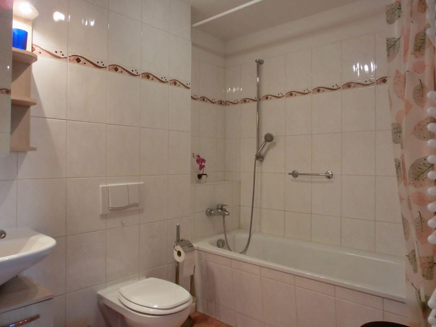 - Badezimmer mit Badewanne, Handtuchheizkörper und Fön