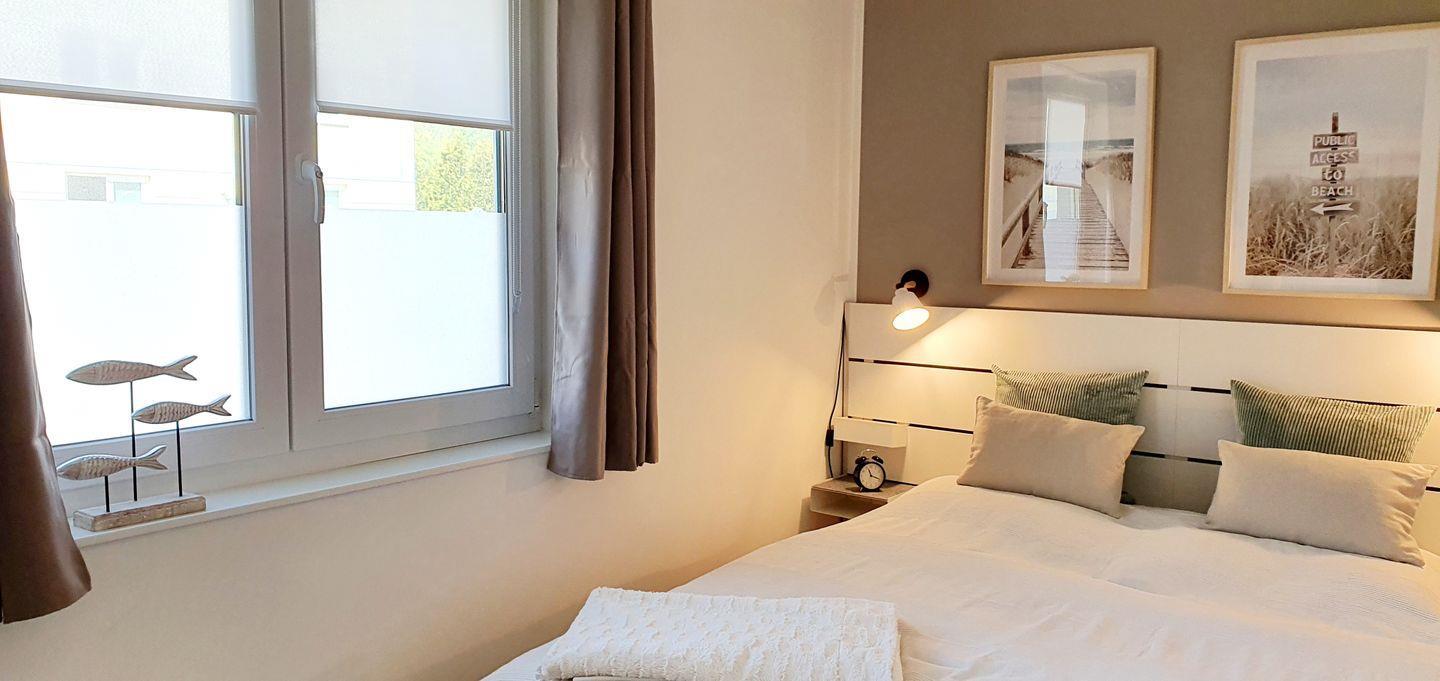 - ein Schlafzimmer mit Doppelbett (160 x 200 cm) für 2 Personen und Verdunklungsvorhänge