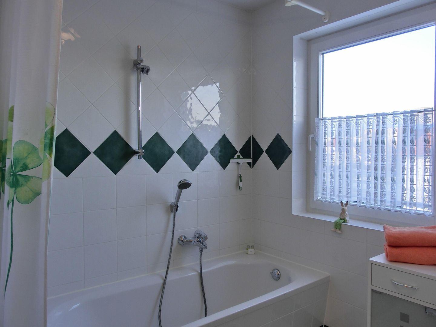 - Badezimmer mit Badewanne (und Duschvorhang) sowie Fußbodenheizung