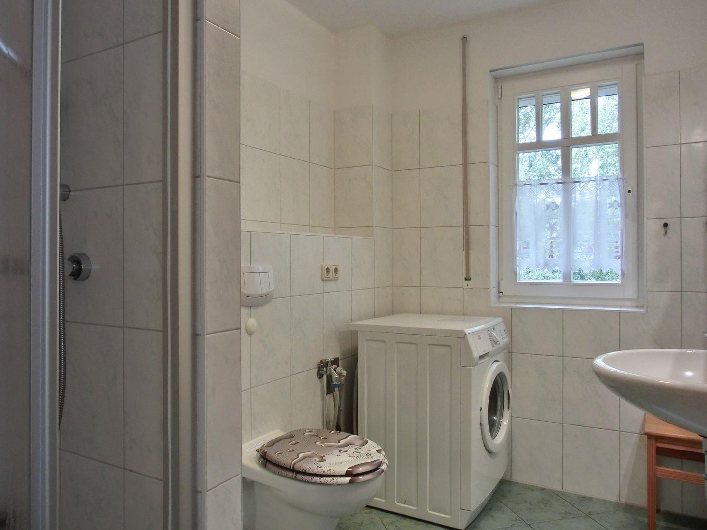 • Modernes Badezimmer mit Dusche, Waschtisch, Waschmaschine und Ablagefläche