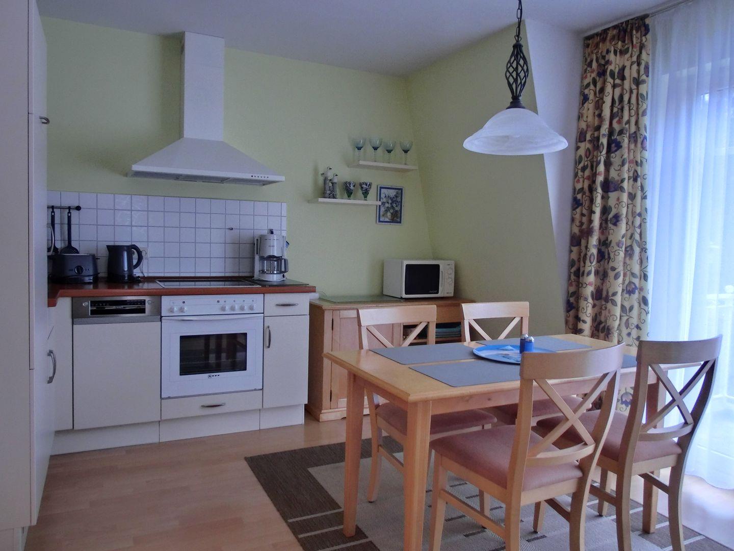 • Küche mit Spülmaschine, Herd, Backofen, Kühlschrank mit Gefrierfach und Mikrowelle