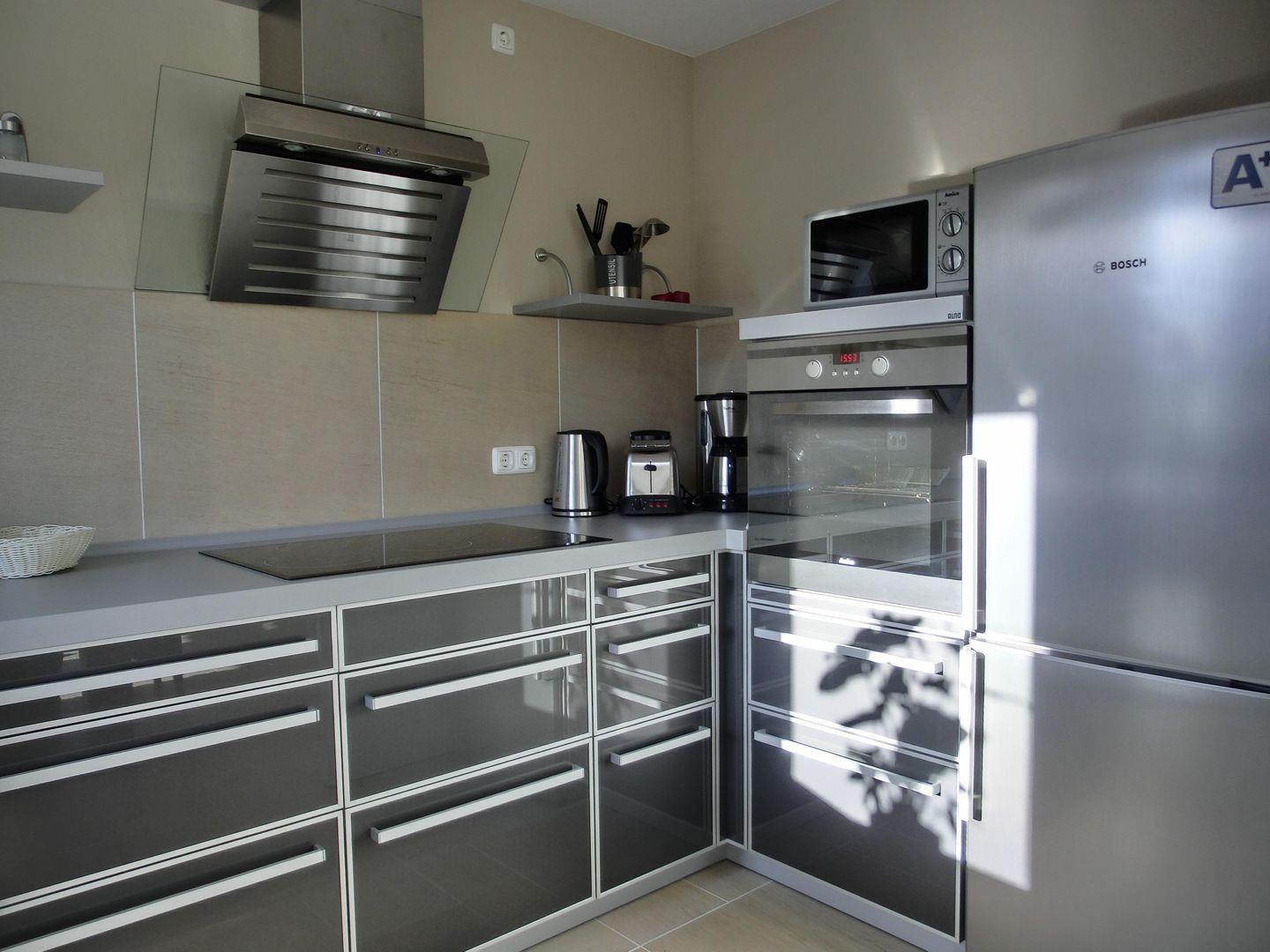• Separate Küche mit Geschirrspülmaschine, Herd mit Backofen, Mikrowelle, Kühlschrank & Gefrierschrank, Kaffeemaschine,