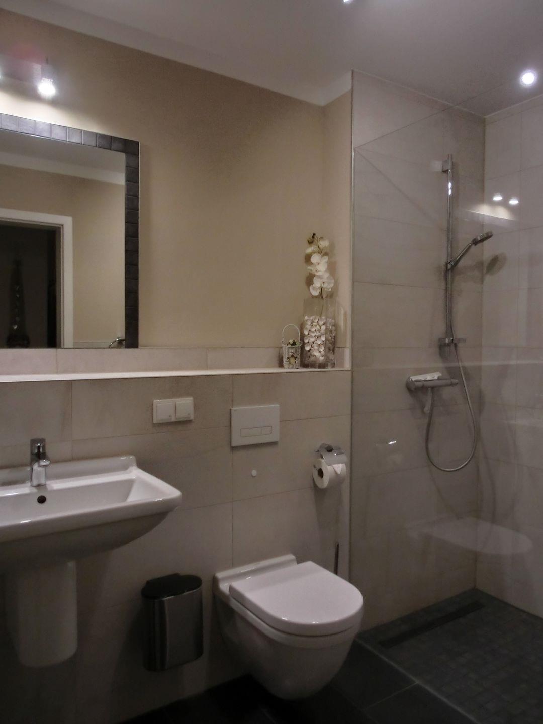 Das Badezimmer ist mit hochwertiger Keramik und einer bodengleicher Echtglasdusche.