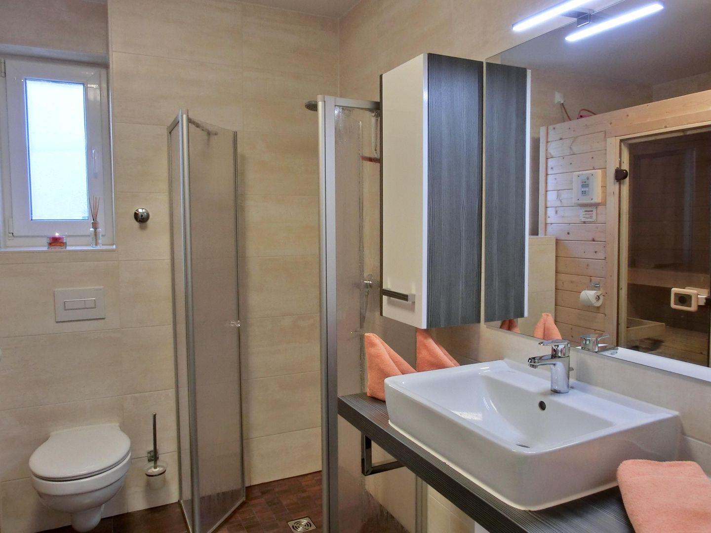 - 1 Badezimmer mit ebenerdiger Dusche und Sauna