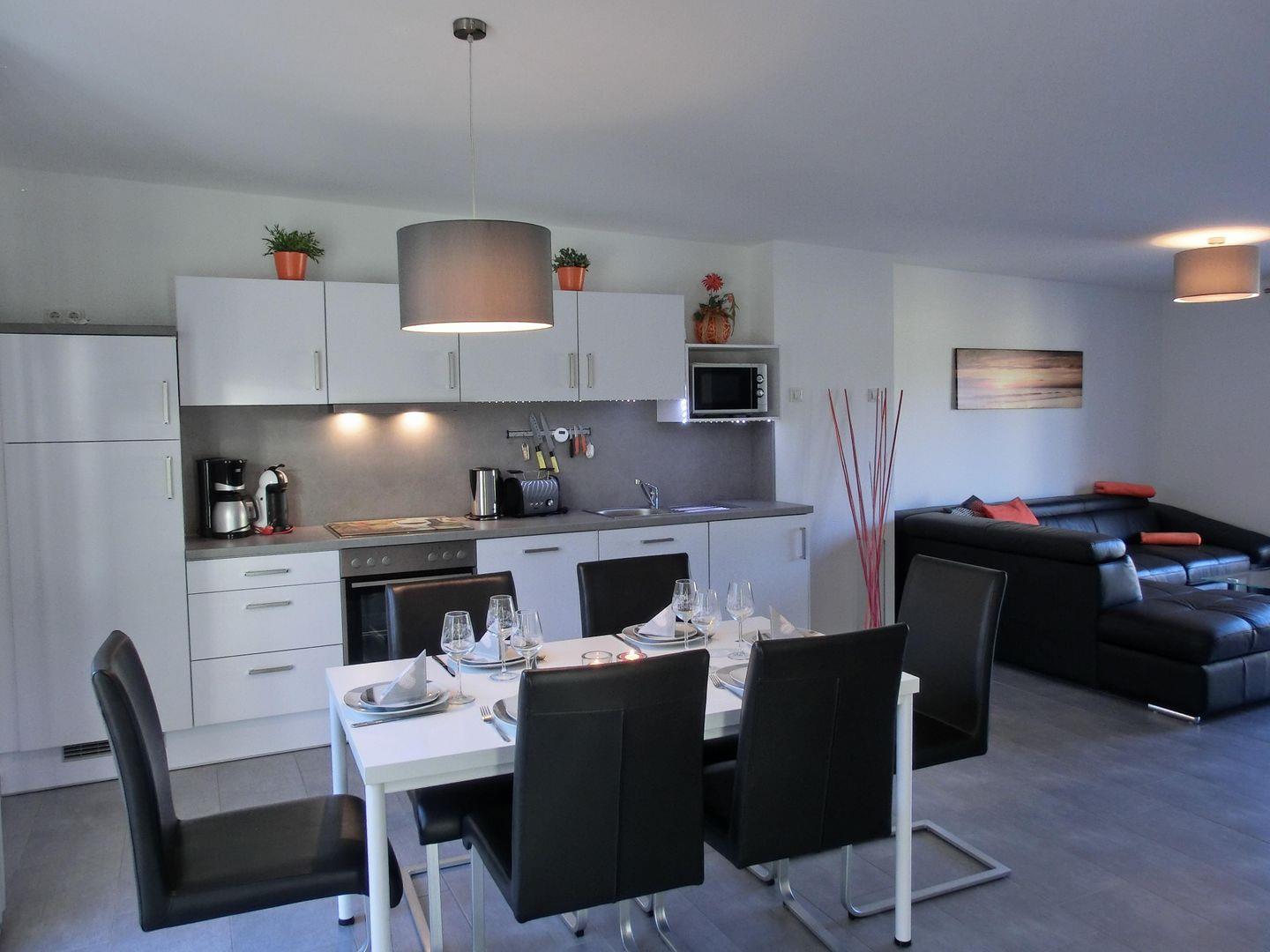 - offene Küche mit Geschirrspülmaschine, Herd, Backofen, Kühlschrank und Gefrierfach, Kaffeemaschine, Toaster, Mikrowelle, Wasserkocher und Waschmaschine