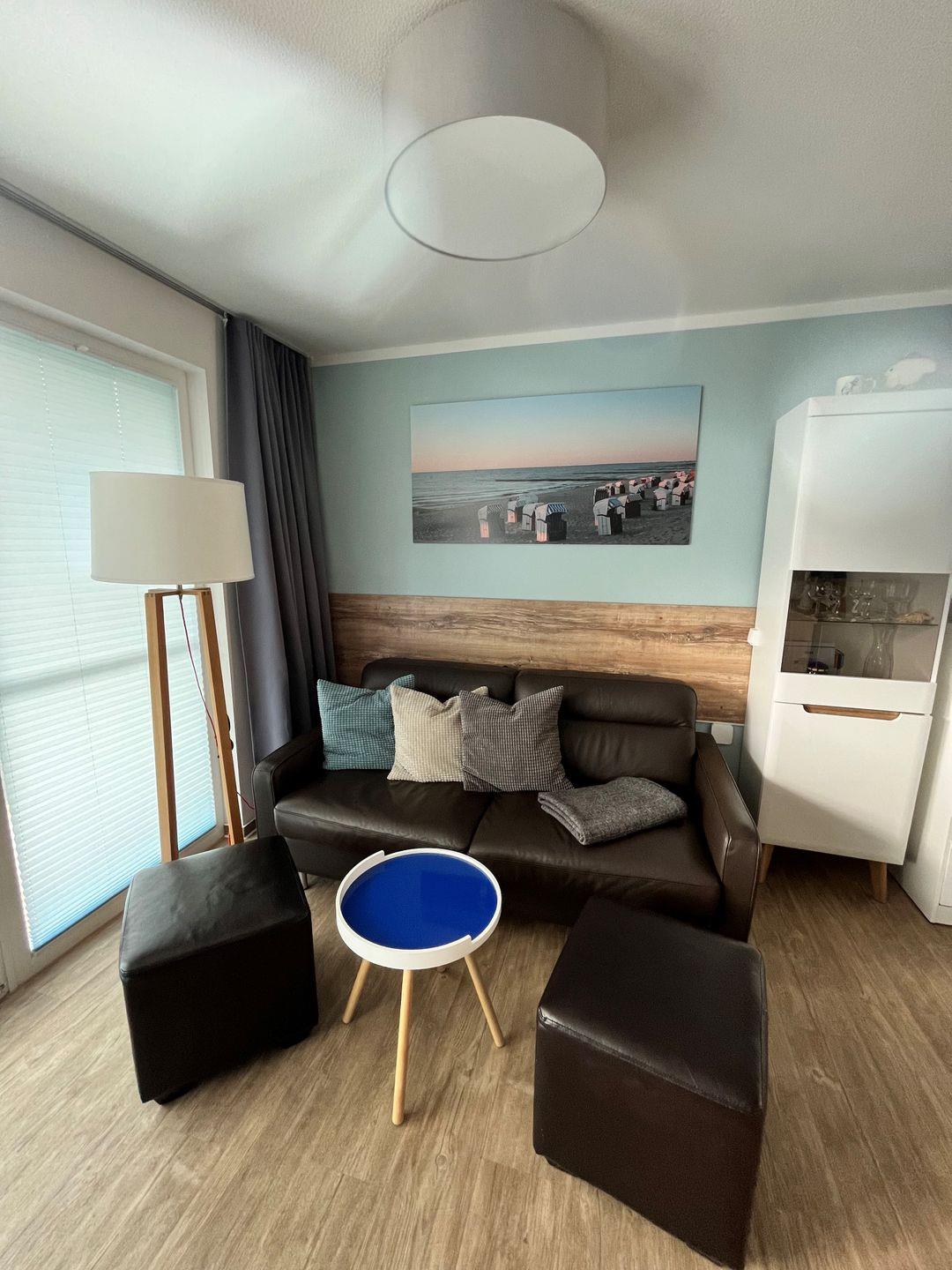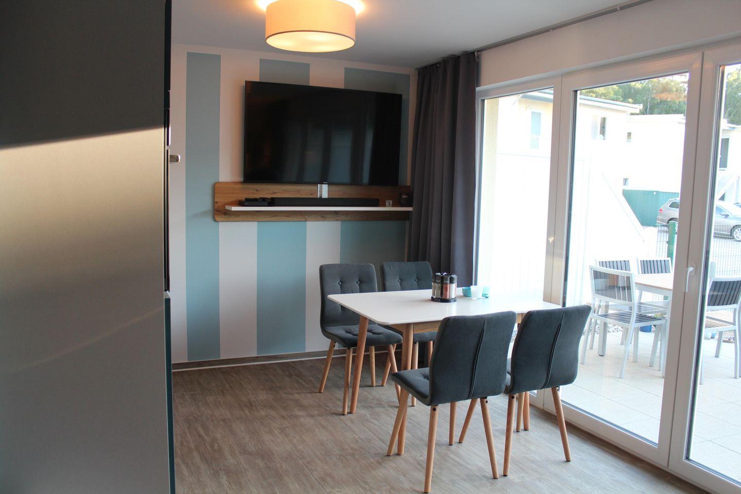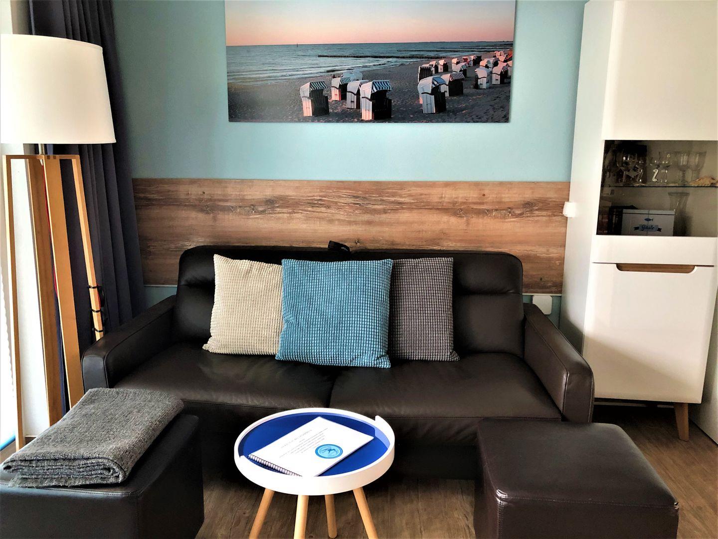 Wohnbereich mit Sitzecke inkl. Sat-TV (58") mit Soundbar und Blu-Ray-Player