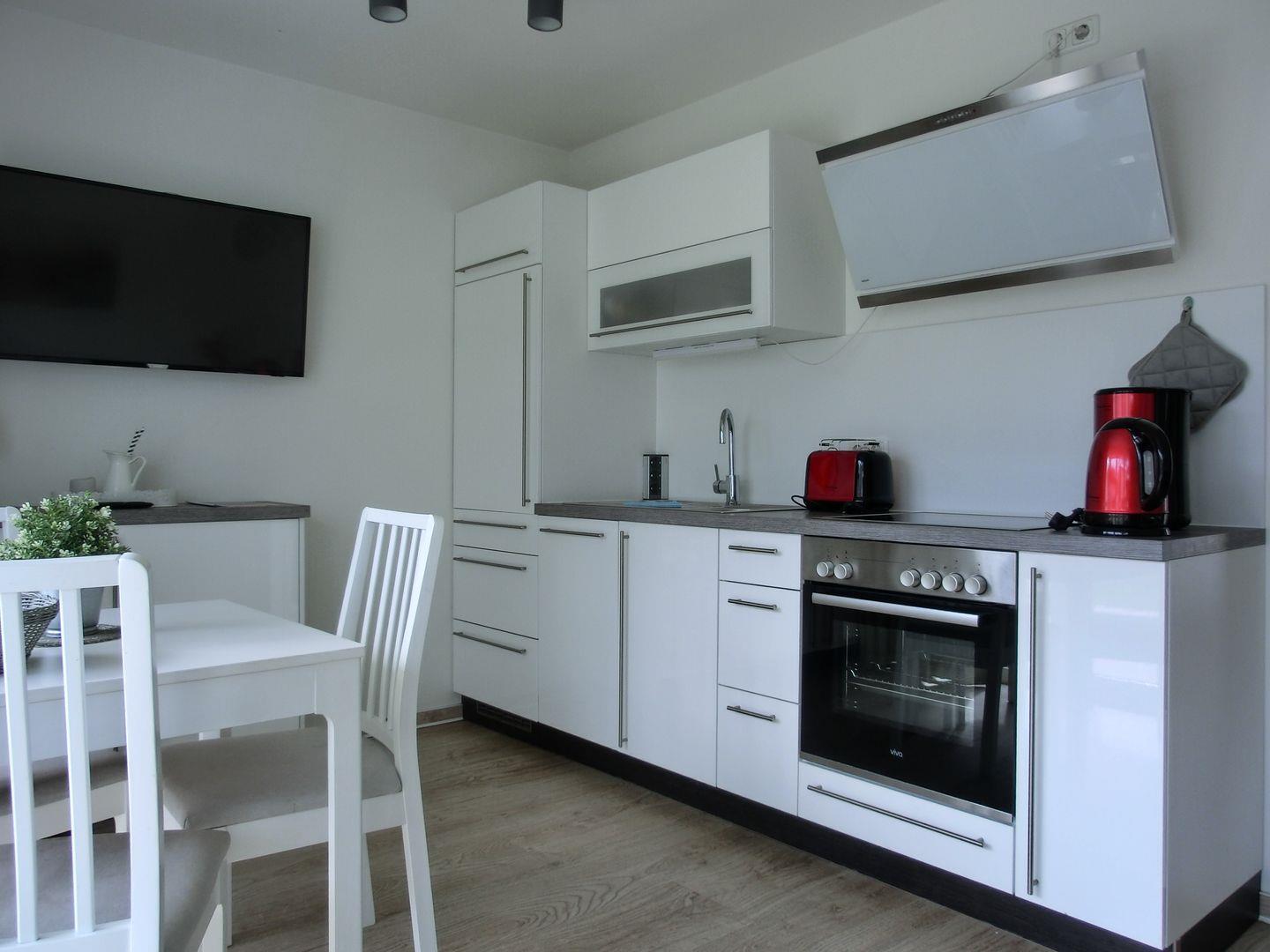 - offene Küche inkl. Herd mit Backofen, Kühlschrank mit Gefrierteil, Kaffeemaschine, Toaster, Wasserkocher, Geschirr