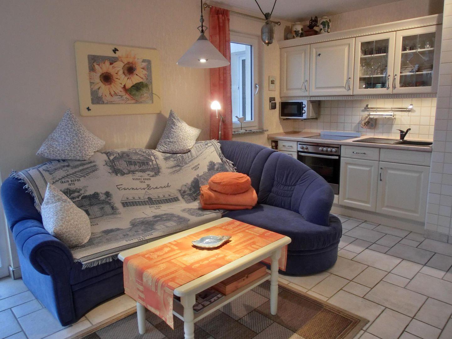 • Wohnbereich mit einem Schlafsofa (120 cm x 190 cm), Smart-TV, DVD-Player mit USB, Stereoanlage