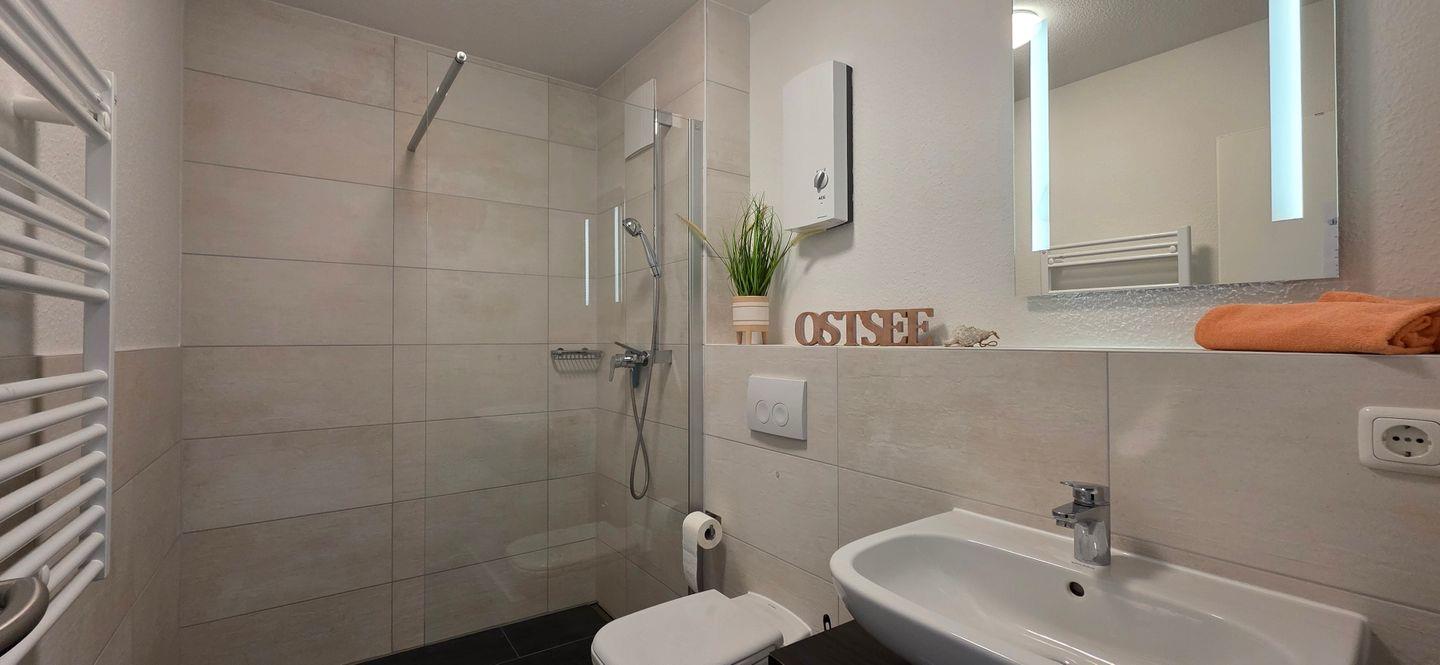 - Das moderne Bad bietet neben ebenerdiger Dusche, WC, Fön, Waschtisch und beheizbarem Handtuchhalter genügend Ablagefläche.