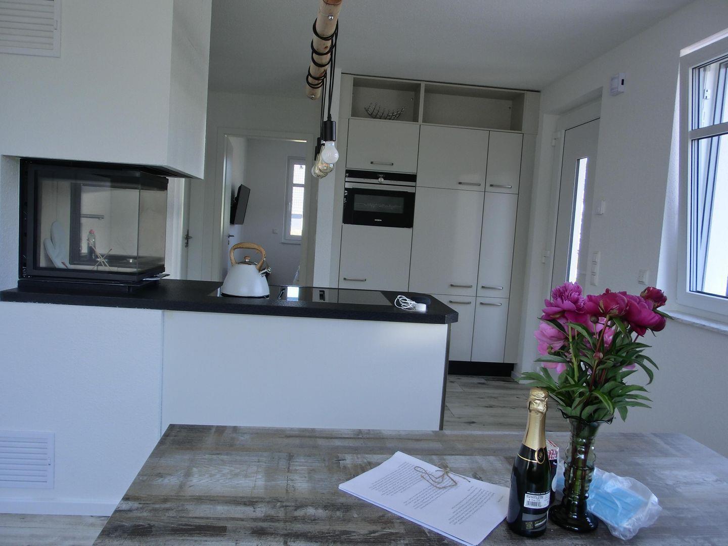 • Die offene Küche ist mit Geschirrspüler, Induktionskochfeld, Backofen, Kühlschrank mit Gefrierteil, Kaffeemaschine, Mikrowelle, Toaster und