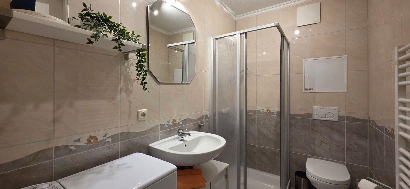 • Badezimmer mit Dusche, Waschbecken und WC