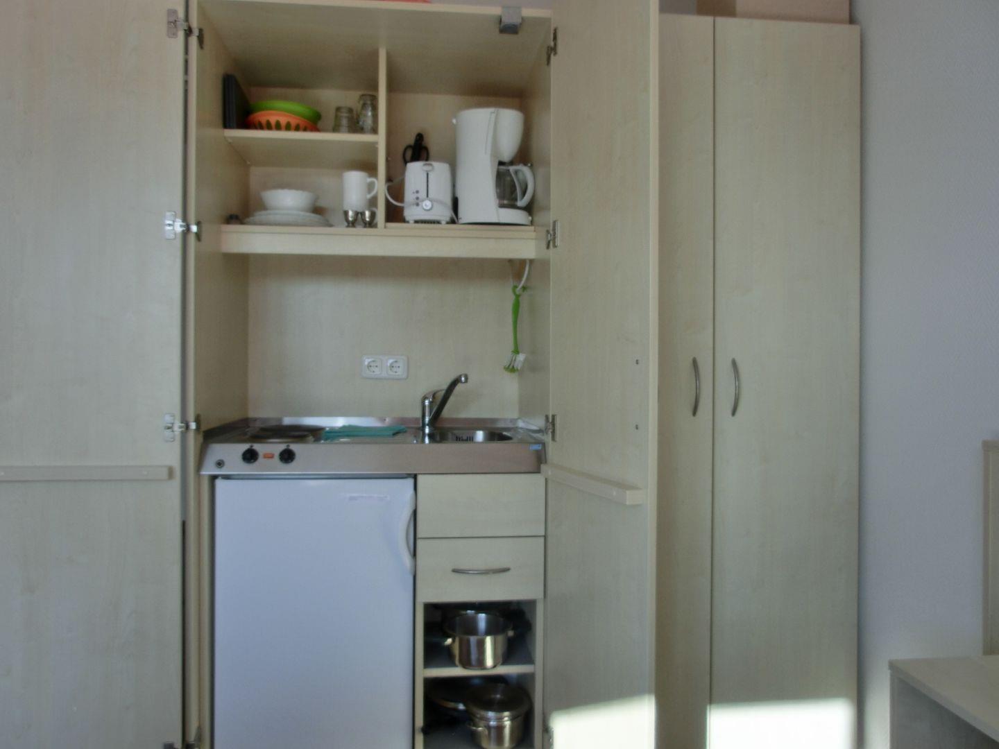 • Pantry-Küche mit einem 2-Plattenkochfeld, Kühlschrank mit Gefrierfach, Kaffeemaschine, Toaster und Wasserkocher