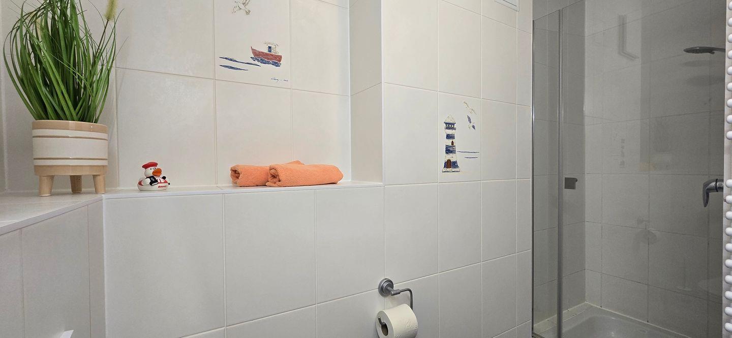 • Badezimmer mit Dusche, WC, Waschtisch und ausreichend Ablagefläche