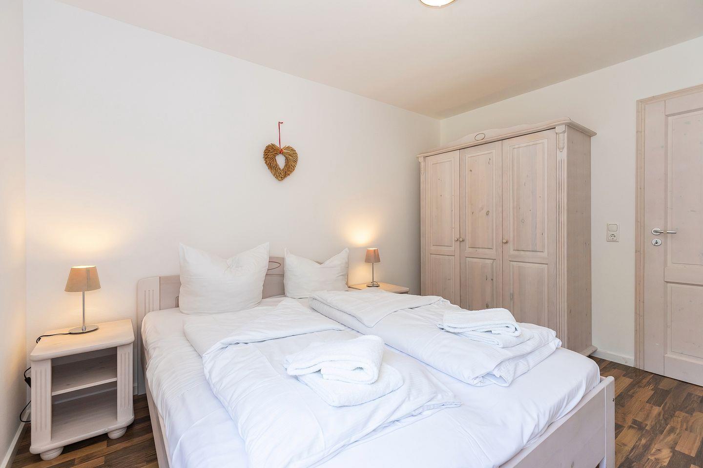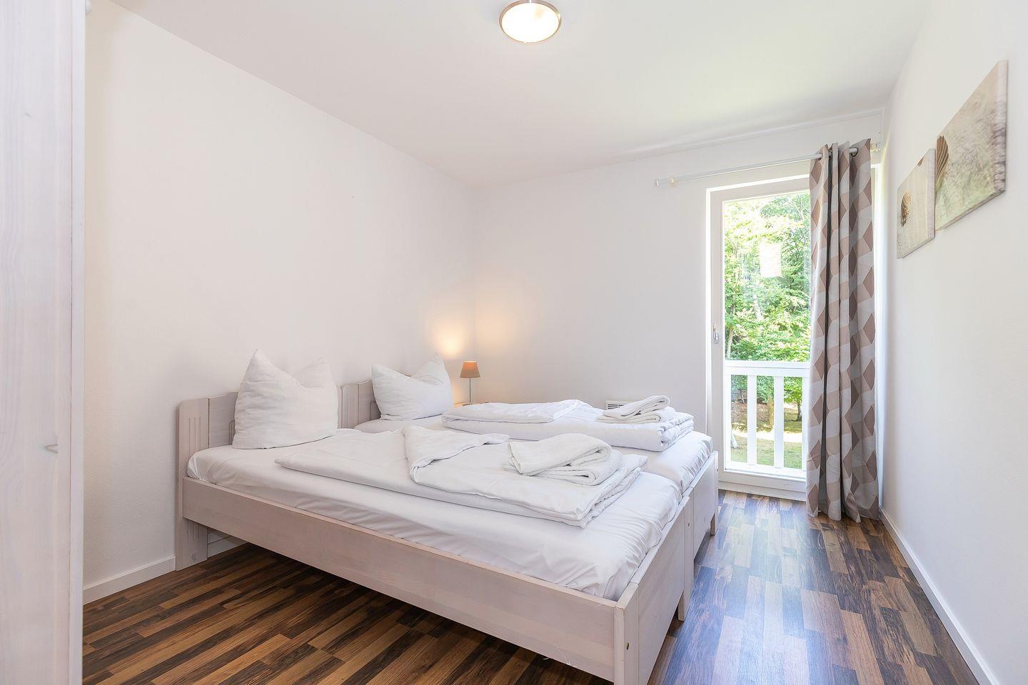 - ein Schlafzimmer mit Doppelbett (180 cm x 200 cm, geteilte Matratze) und ein weiteres Schlafzimmer mit zwei Einzelbetten (90 cm x 200 cm)