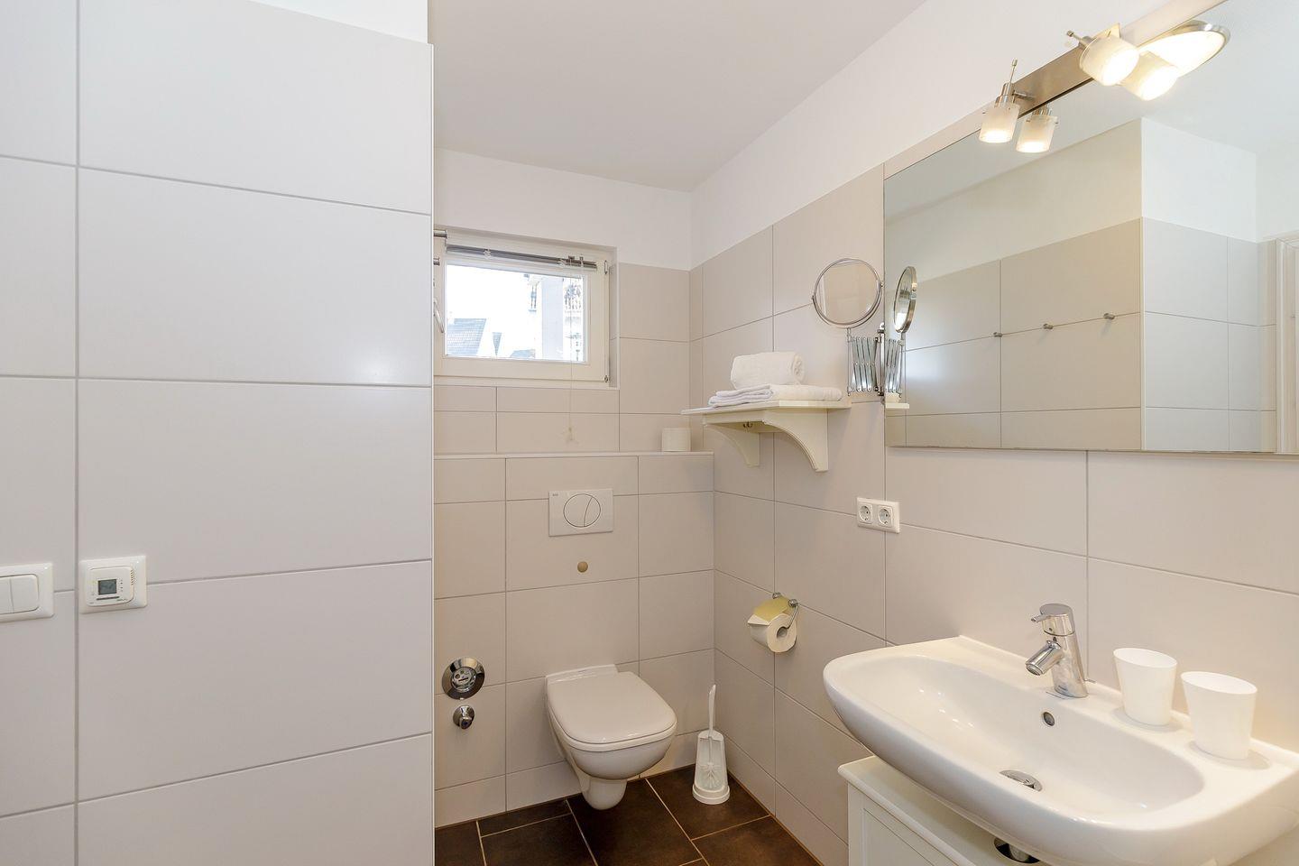 - Tageslichtbadezimmer mit ebenerdiger Dusche, Haartrockner und genügend Ablagefläche