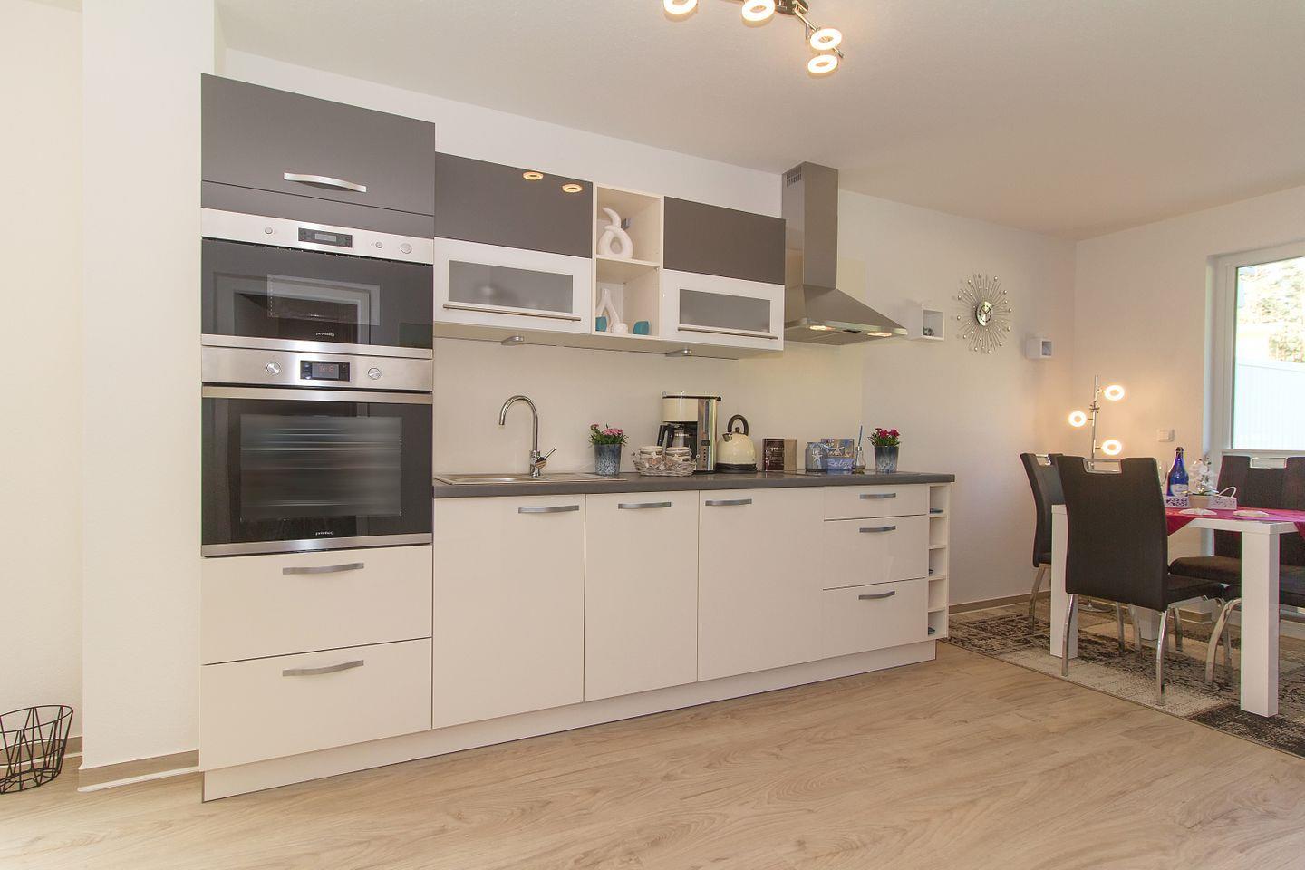 - offene Küche inkl. Herd mit Backofen, Geschirrspülmaschine, Kühlschrank mit Gefrierteil, Kaffeemaschine, Toaster, Wasserkocher, Eierkocher
