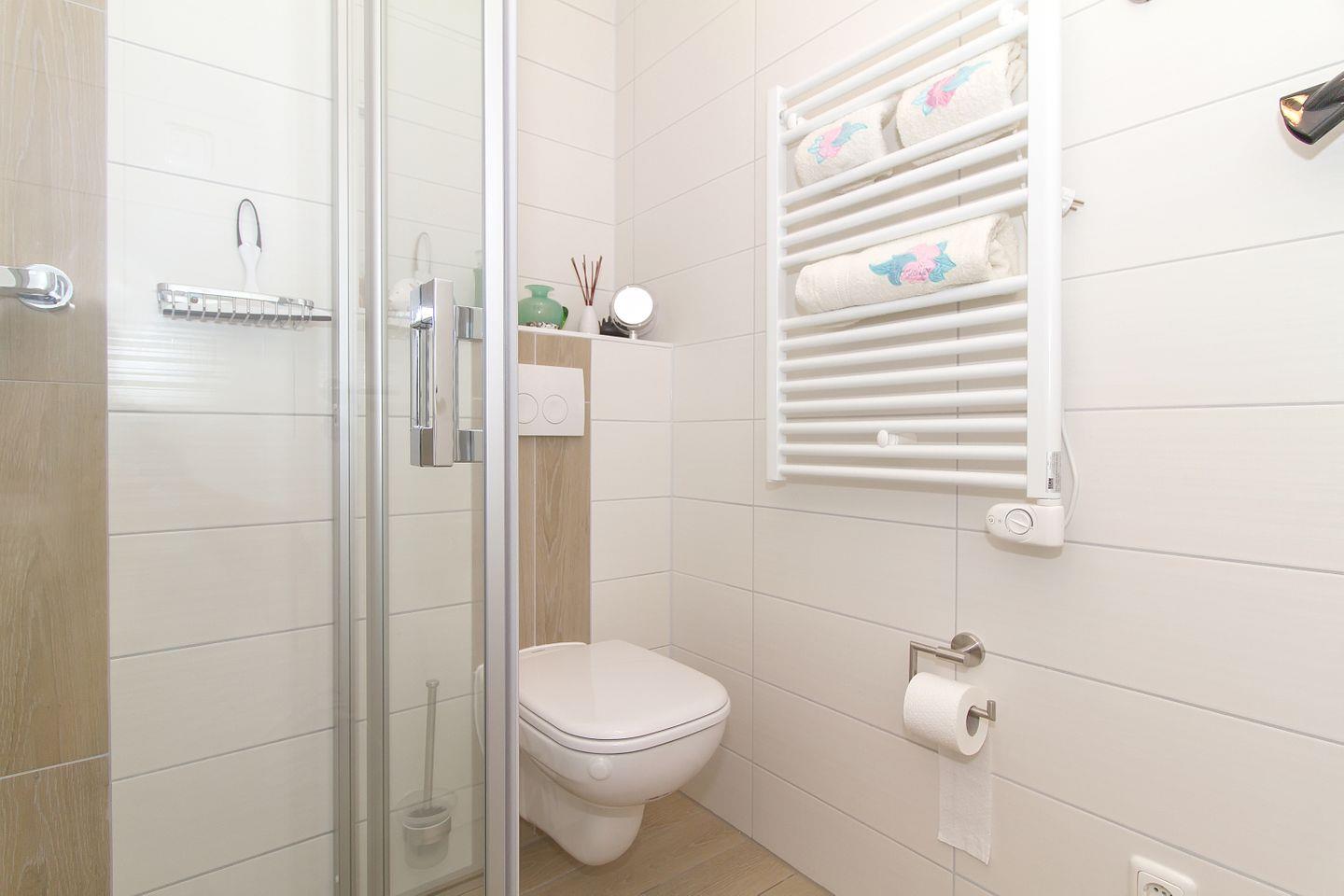 • Modernes Tageslichtbad mit WC, ebenerdiger Dusche, Fön, Handtuchheizkörper, Kosmetikspiegel & großzügiger Ablagefläche